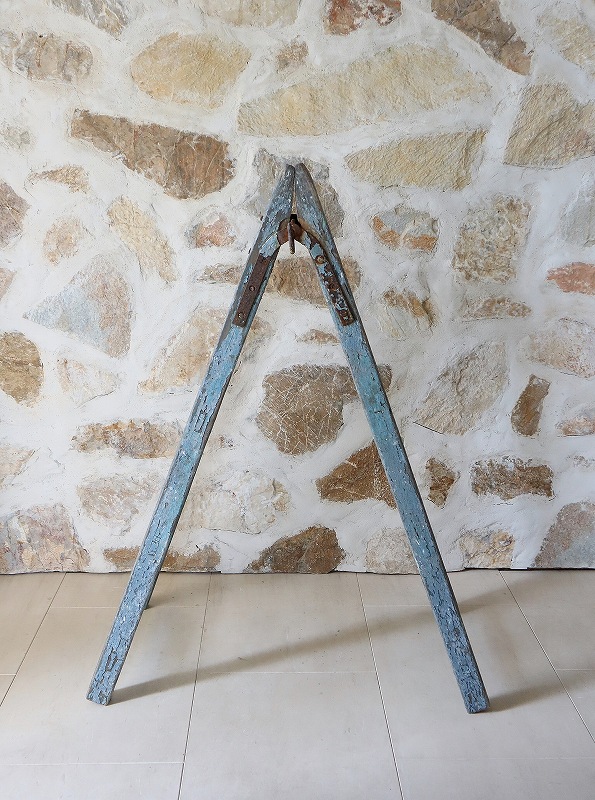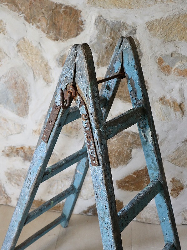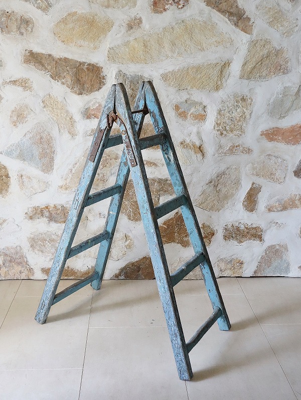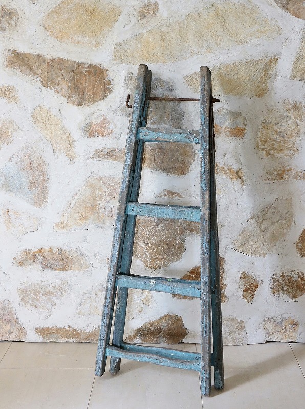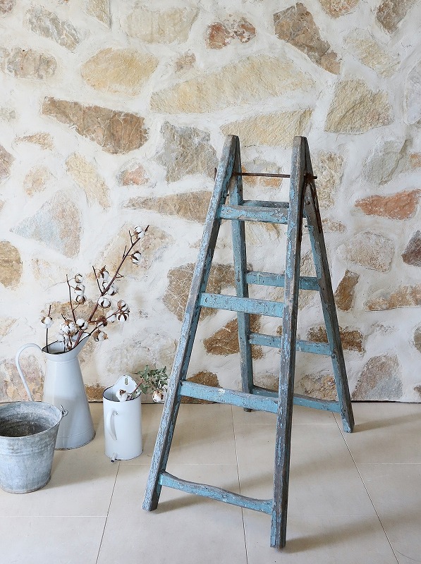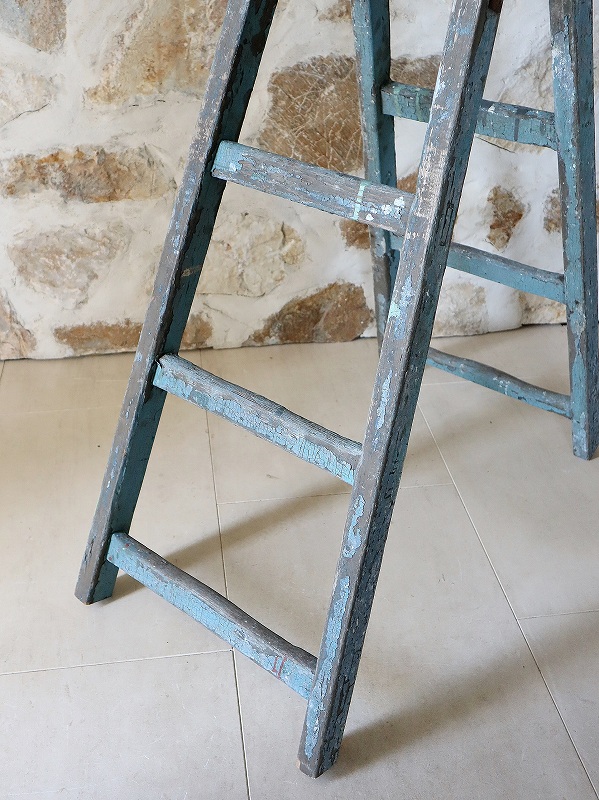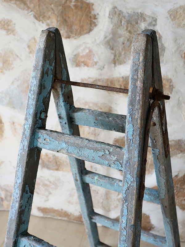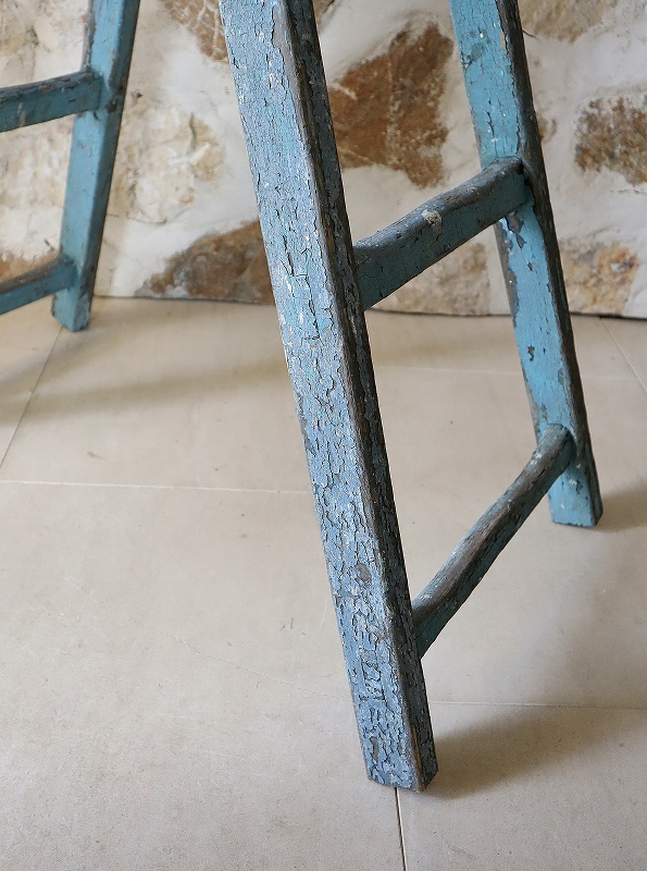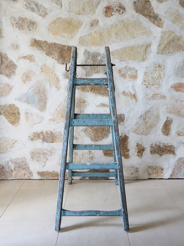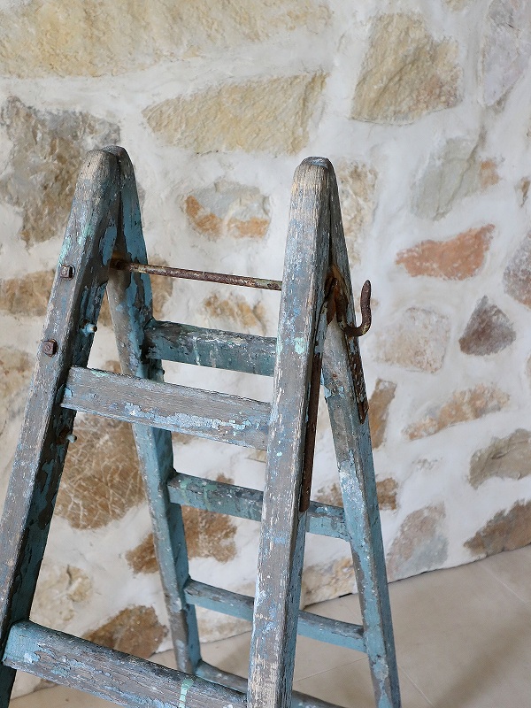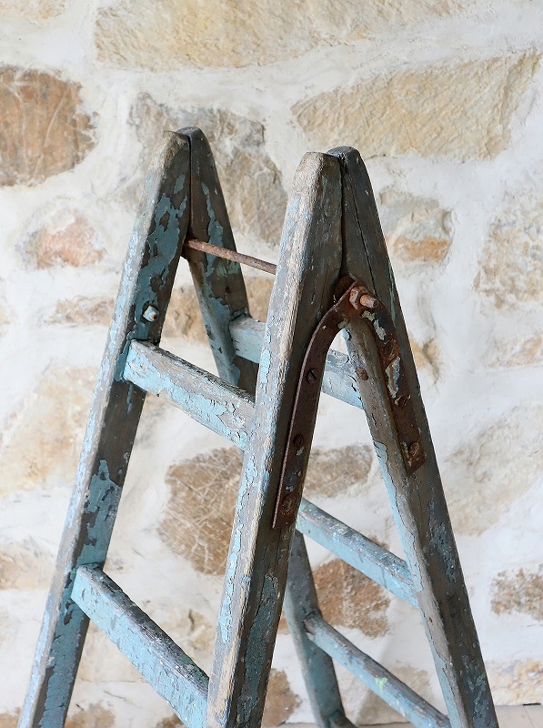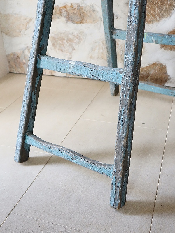 フランスの木製ラダーです。シャビーなオリジナル(元々の古い)ペイントが素朴でかわいいです。ディスプレイ用として、グリーンやガーデングッズなど合わせていただくとかわいいと思います。