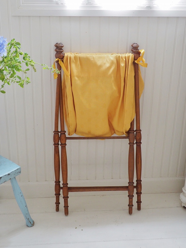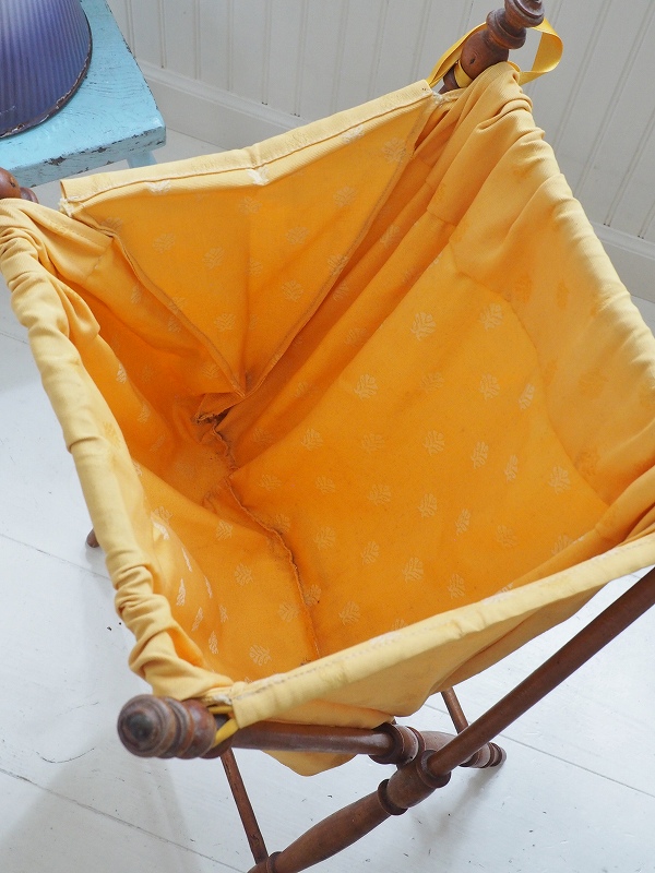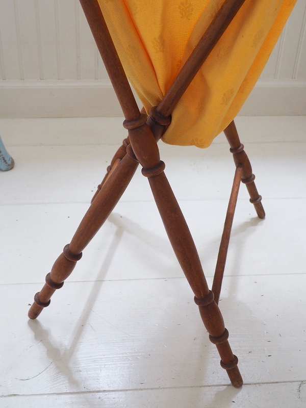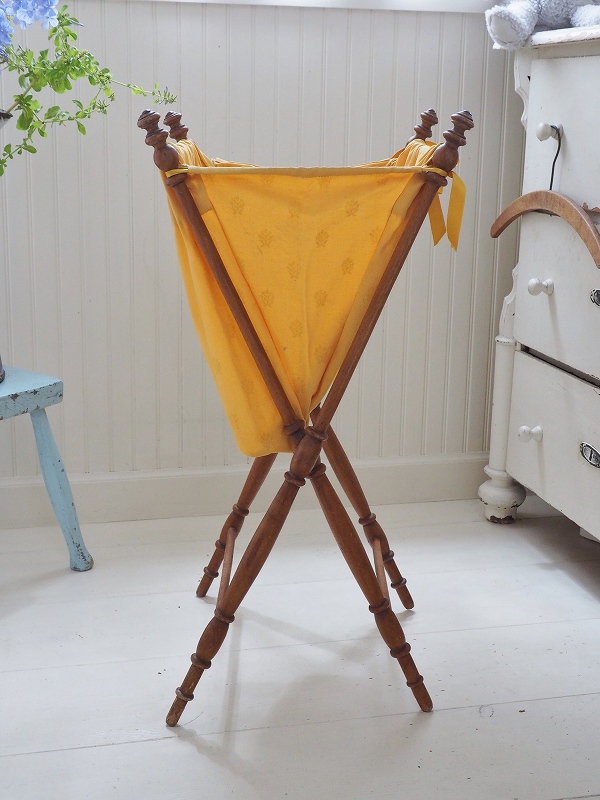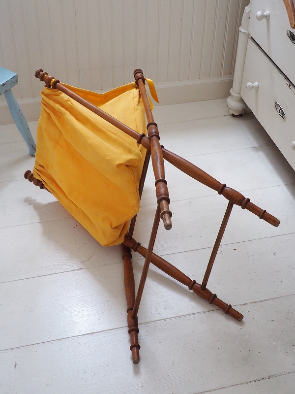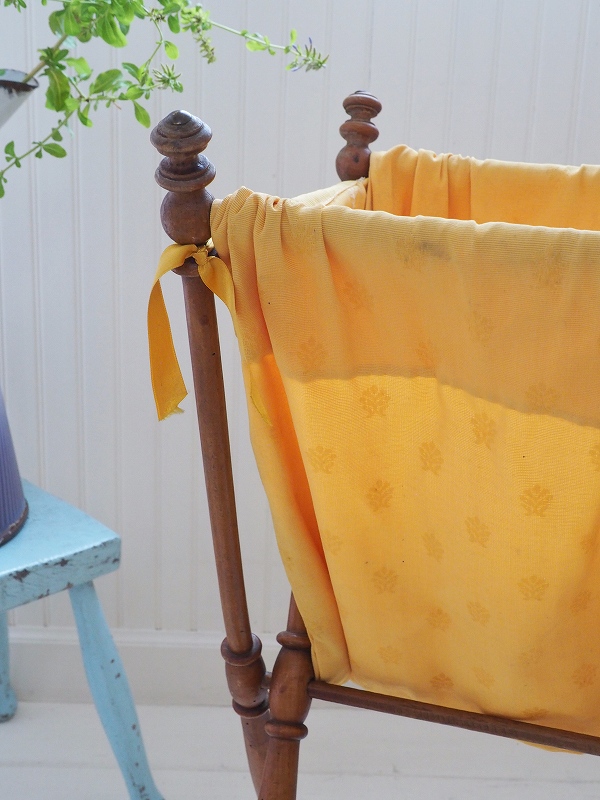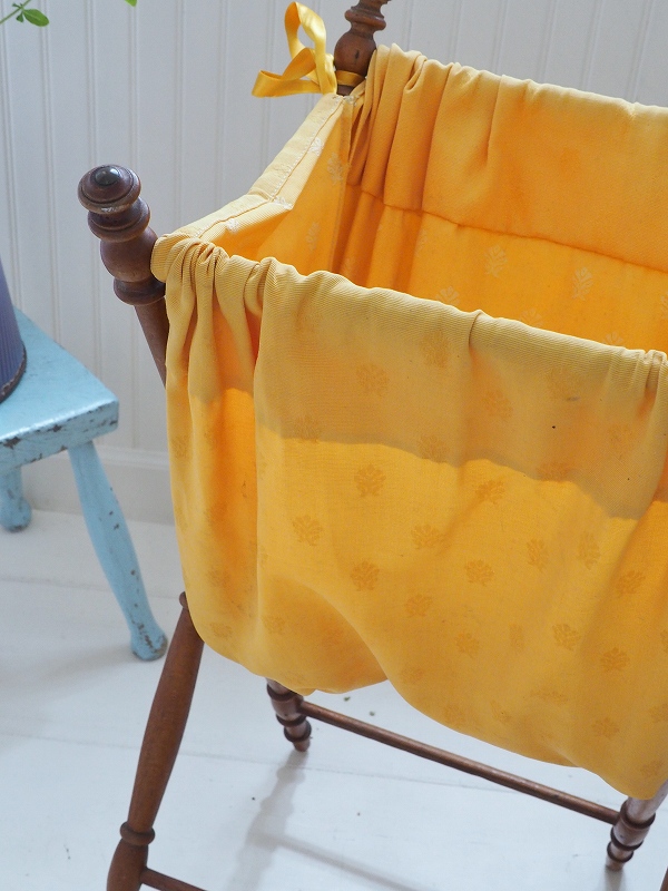 折りたたむことができるフランス製のソーイングバスケットです。手芸中の色々なものをとりあえず布の中に置いておくバスケットで、使わない時は折りたためて場所を取らず置いておくだけでもかわいいです。小物入れに使われても素敵だと思います。ファブリックをカットして、お好きなファブリックに替えてオリジナルを楽しまれている方も多いです。比較的ファブリックの状態はよく、木質感や真鍮の金物も付いていて素敵です。