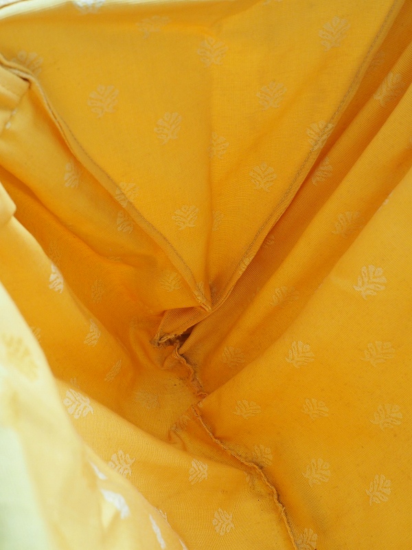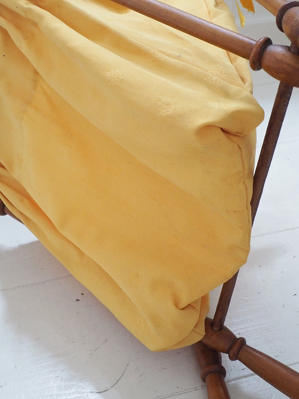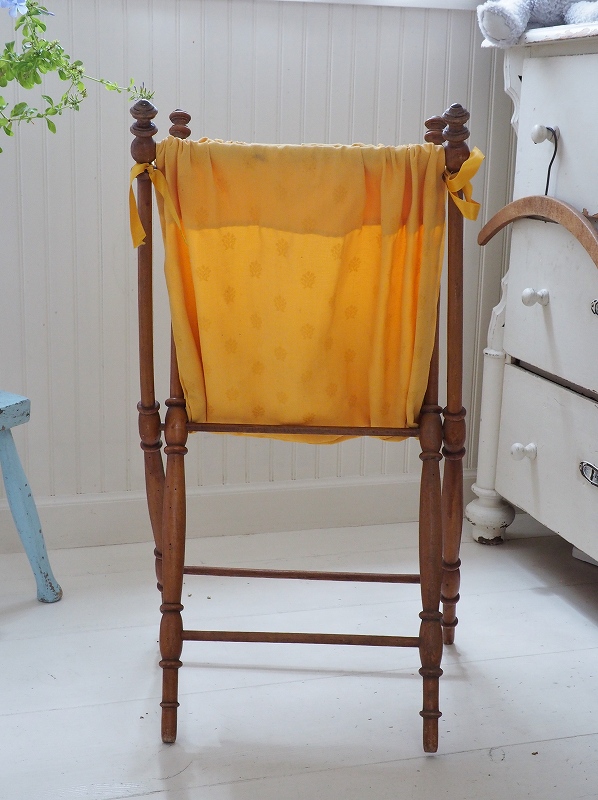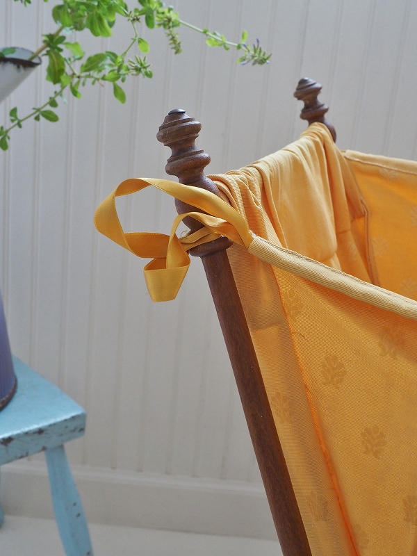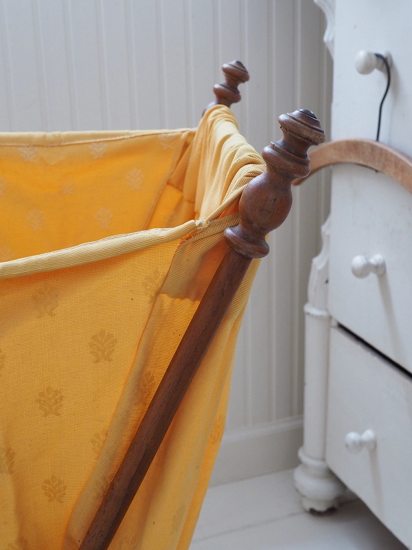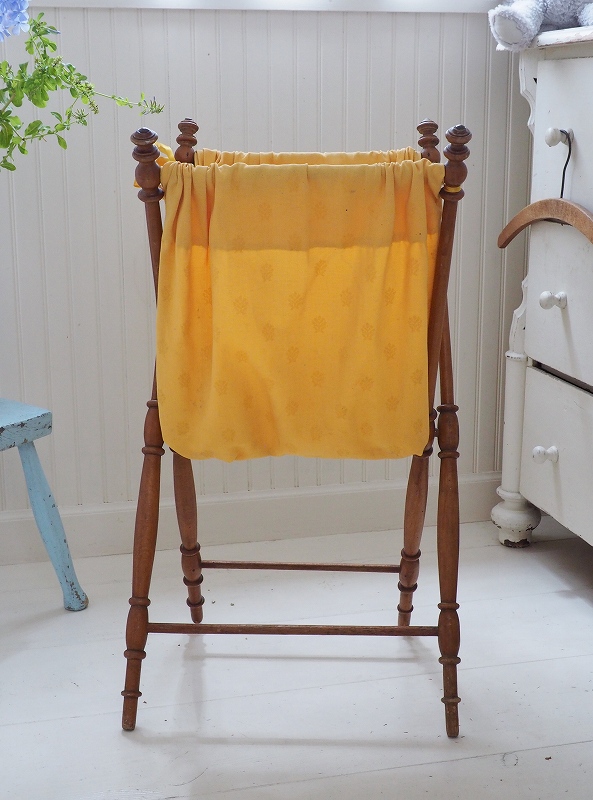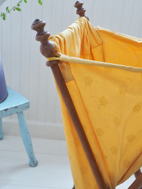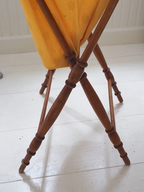 折りたたむことができるフランス製のソーイングバスケットです。手芸中の色々なものをとりあえず布の中に置いておくバスケットで、使わない時は折りたためて場所を取らず置いておくだけでもかわいいです。小物入れに使われても素敵だと思います。ファブリックをカットして、お好きなファブリックに替えてオリジナルを楽しまれている方も多いです。比較的ファブリックの状態はよく、木質感や真鍮の金物も付いていて素敵です。