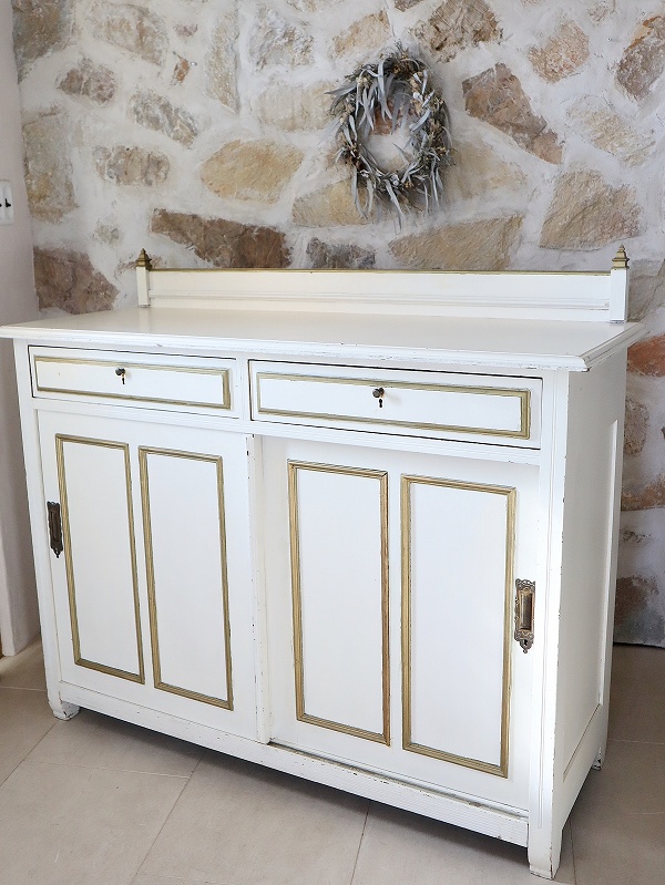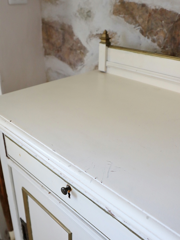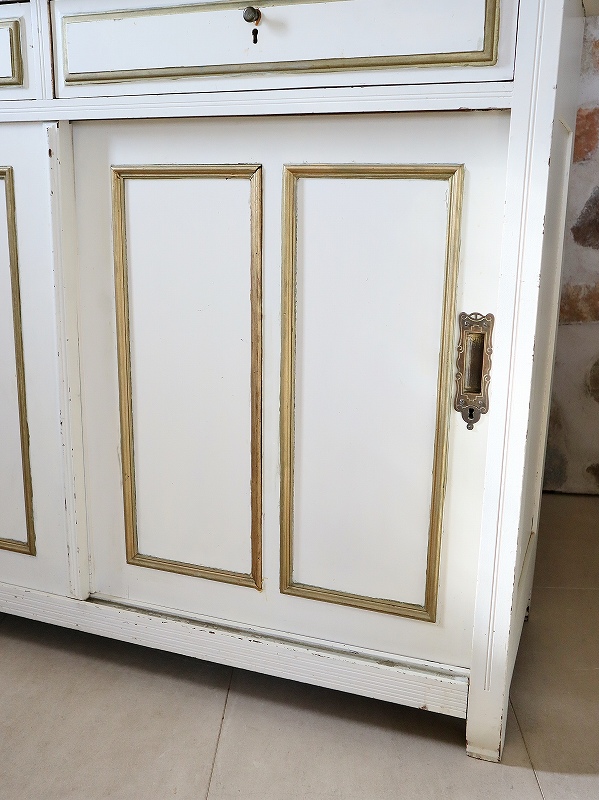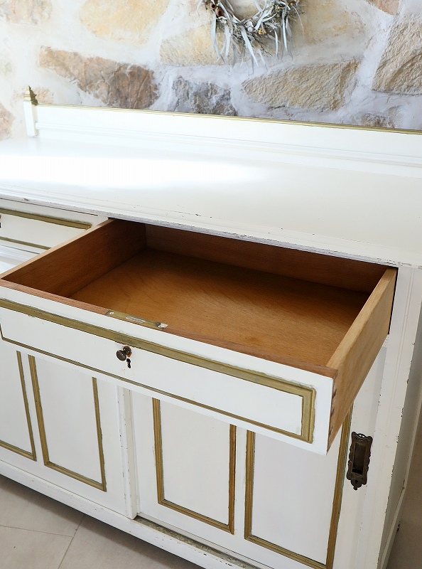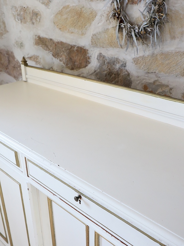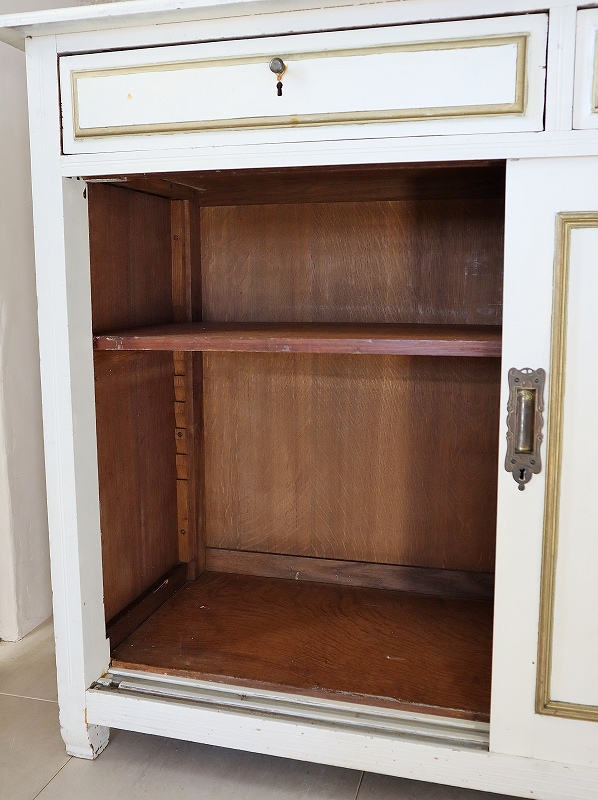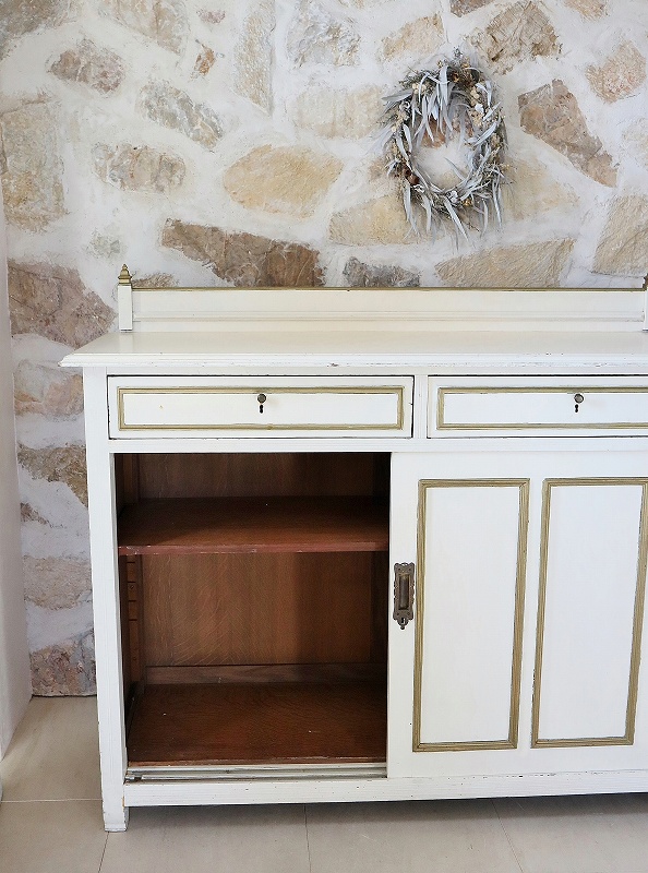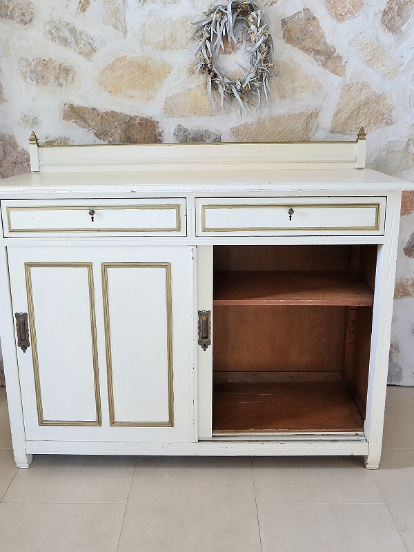 ドイツで買い付けしたキャビネットです。ゴールドのラインが派手ではなく大人っぽくて雰囲気があるアンティーク家具です。珍しく引き戸ですので、前の空きが少ないスペースでも置けます。内部は古い様式の桟があり、可動棚が1枚付いています。収納量が多く便利です。