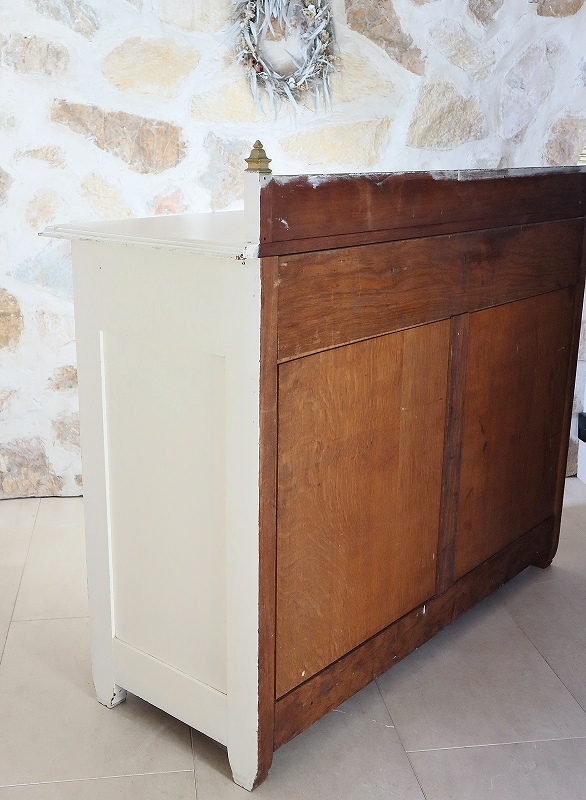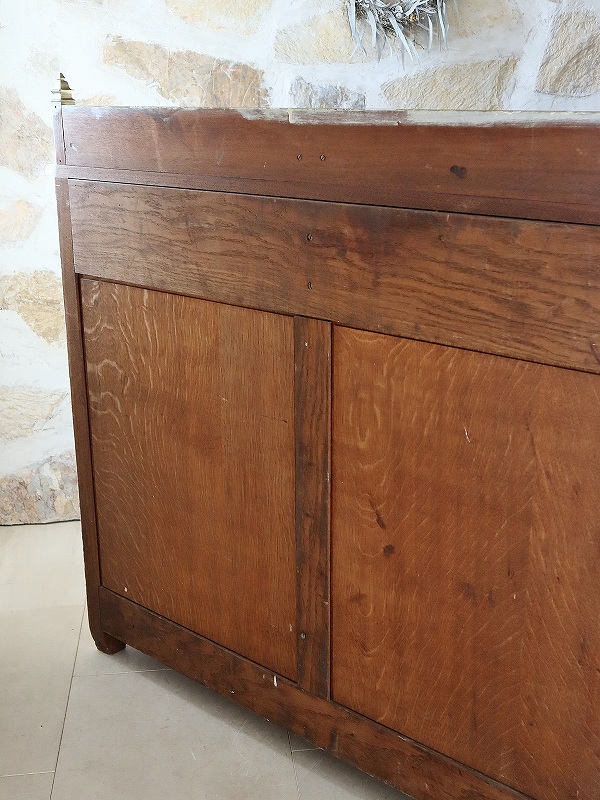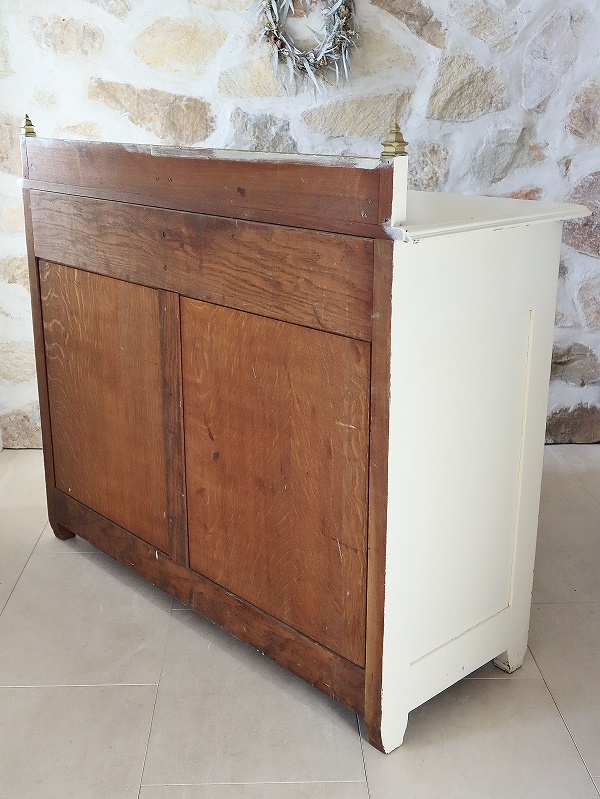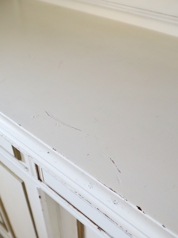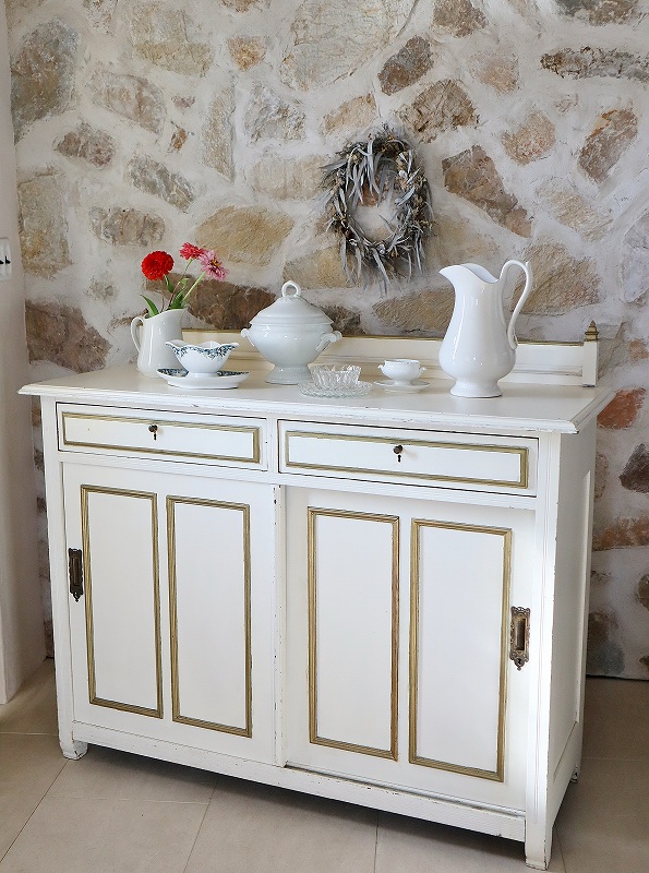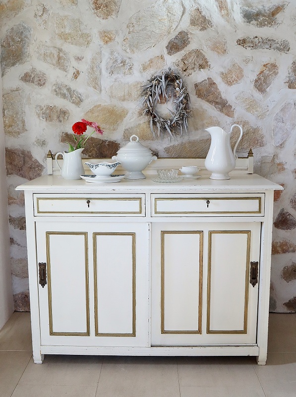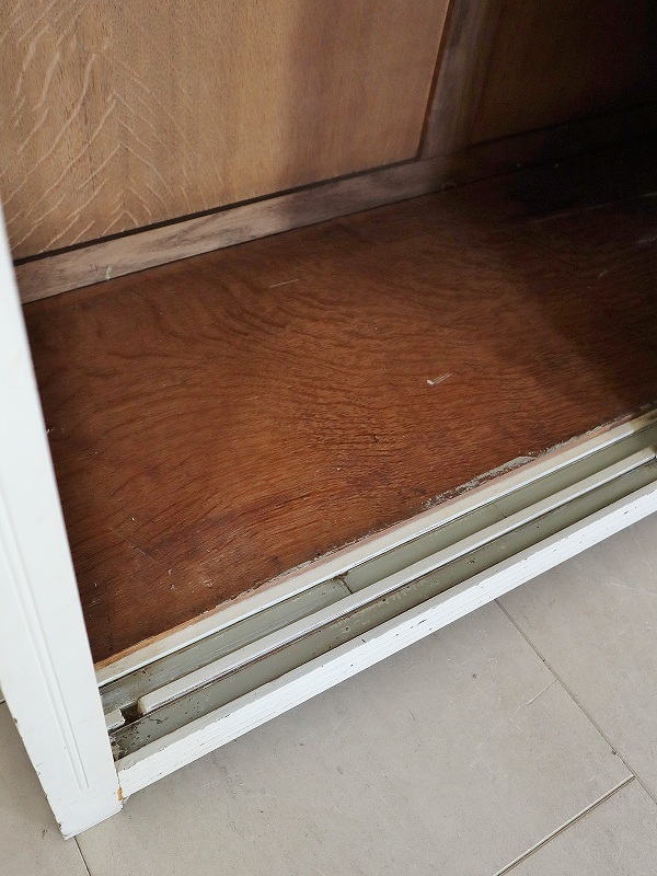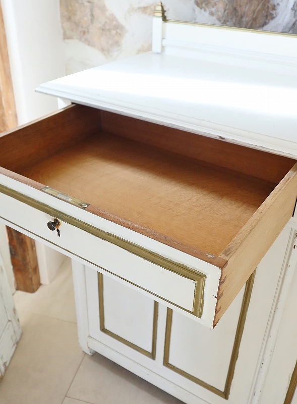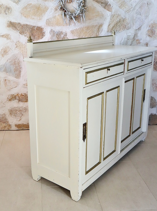 ドイツで買い付けしたキャビネットです。ゴールドのラインが派手ではなく大人っぽくて雰囲気があるアンティーク家具です。珍しく引き戸ですので、前の空きが少ないスペースでも置けます。内部は古い様式の桟があり、可動棚が1枚付いています。収納量が多く便利です。