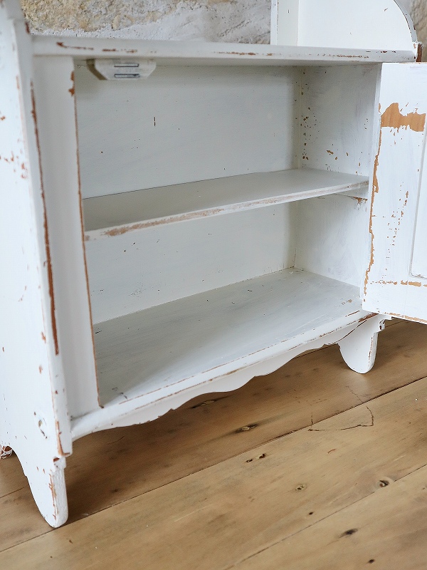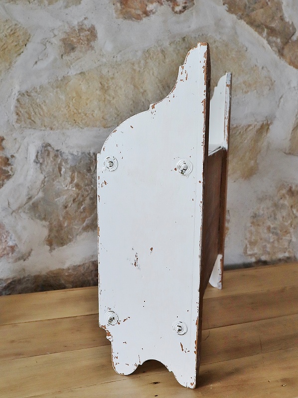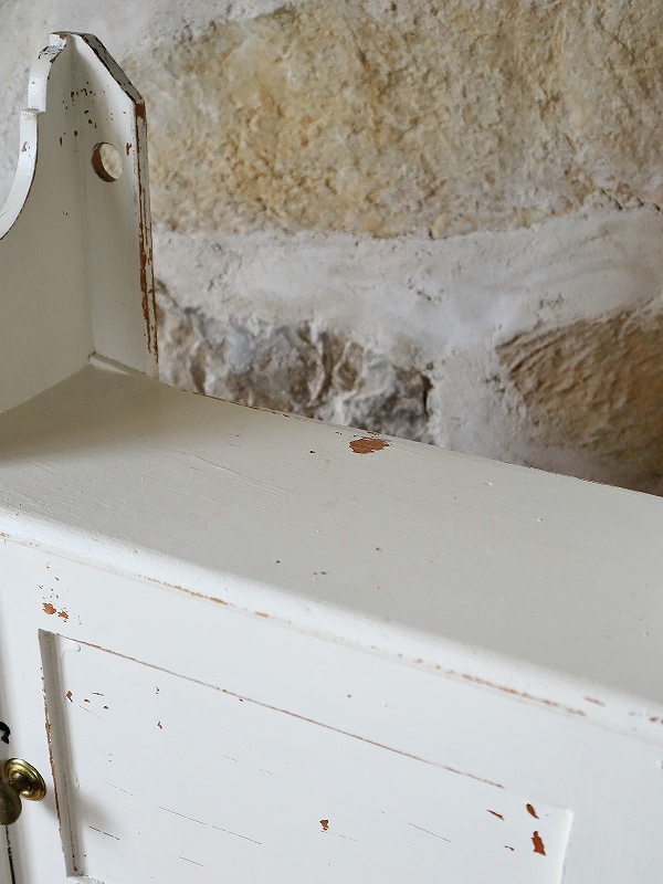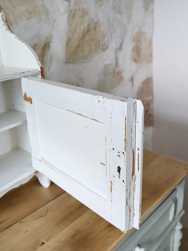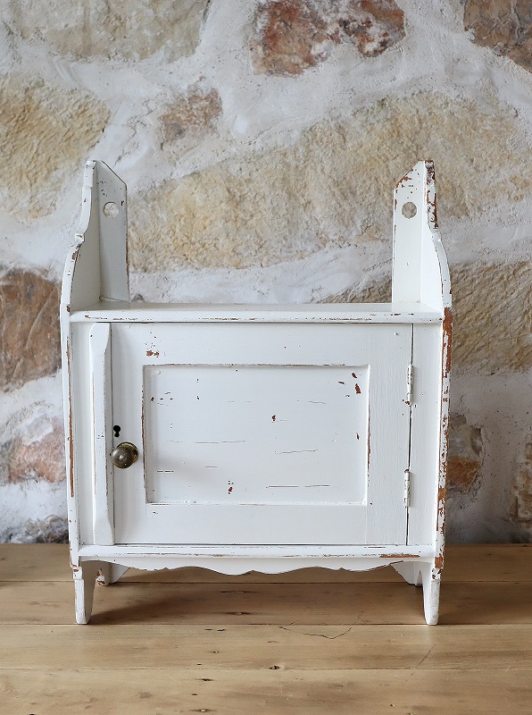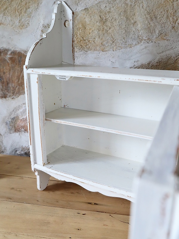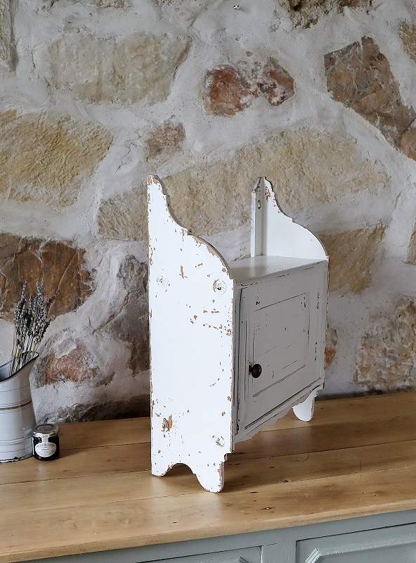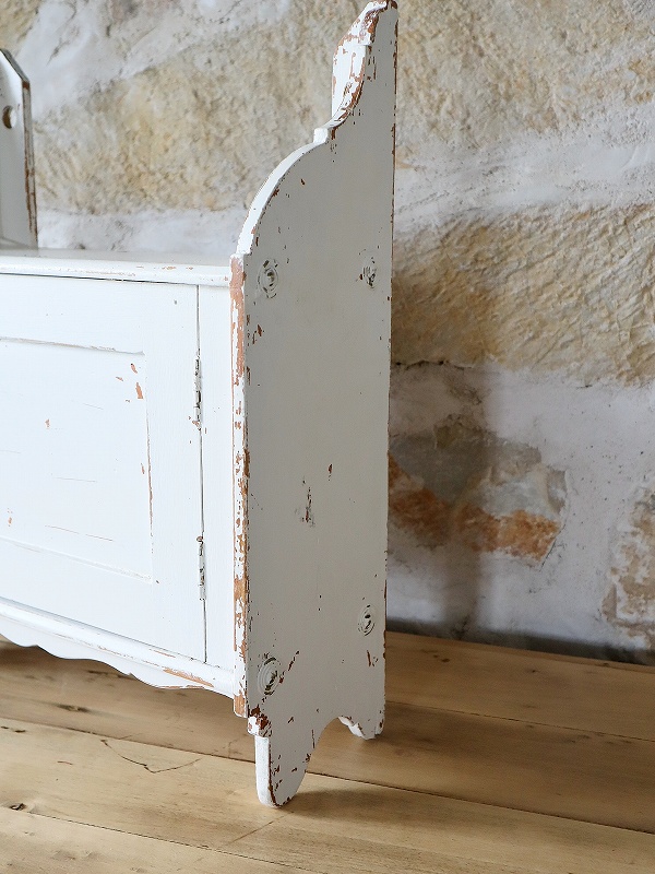 フランスのウォールキャビネットです。なみなみのかわいいデザインが目を引きます。壁掛けですが、小振りでキャビネットなどの上にも置きやすいです。置いて使われる時も壁に固定されると安心です。内部に固定棚が1枚付いていて、細々としたものの収納に便利です。
