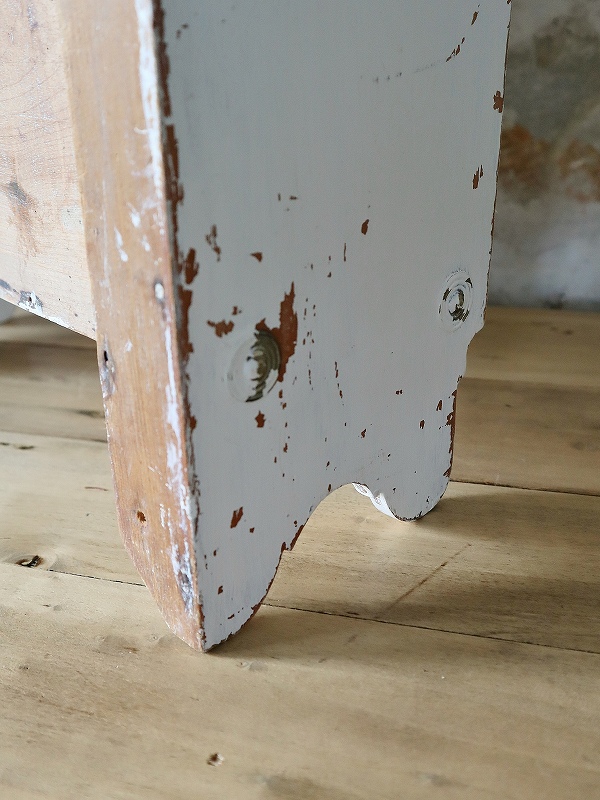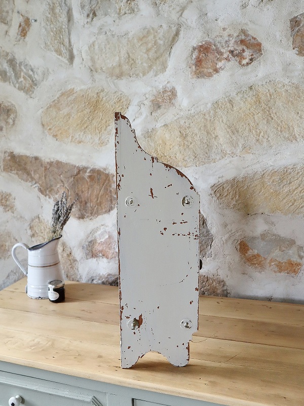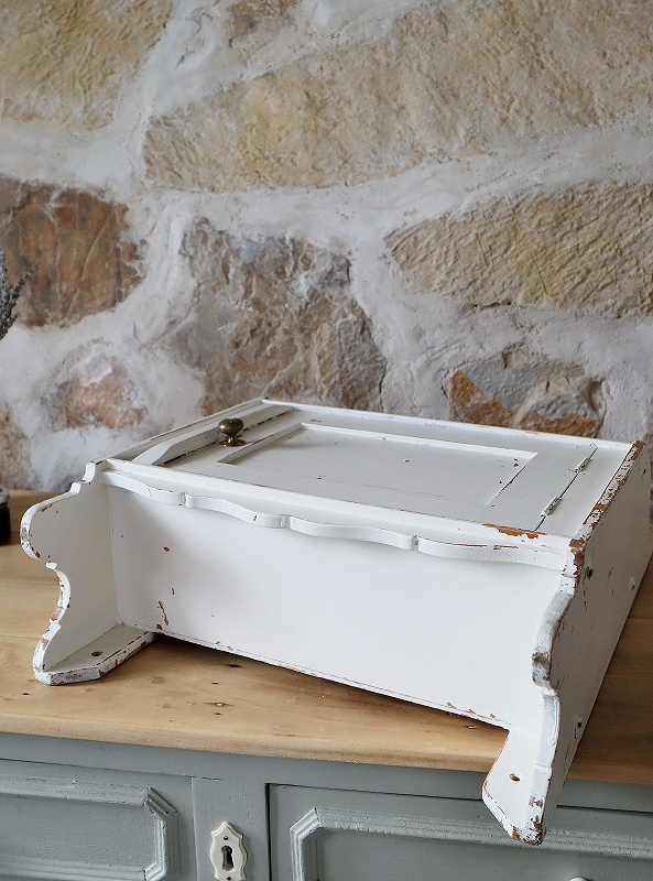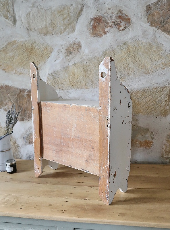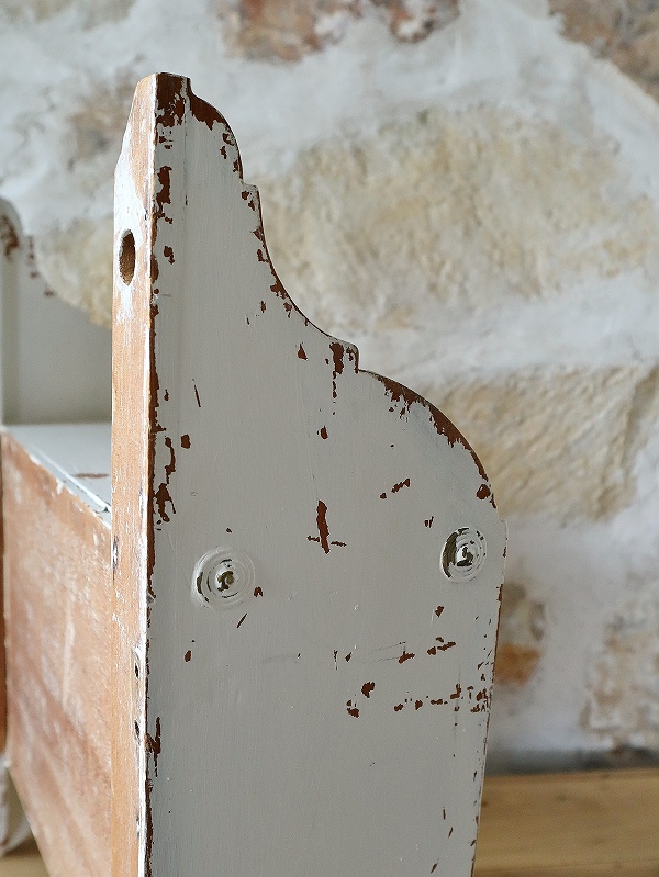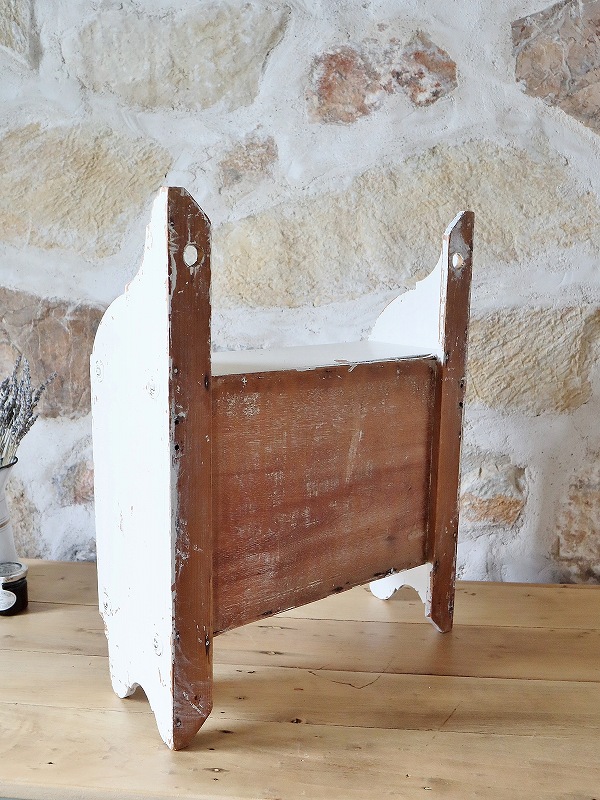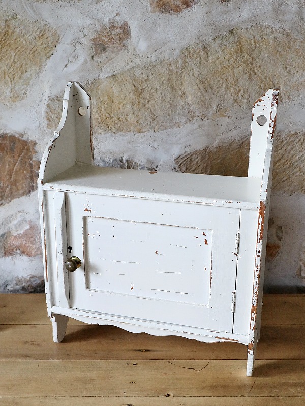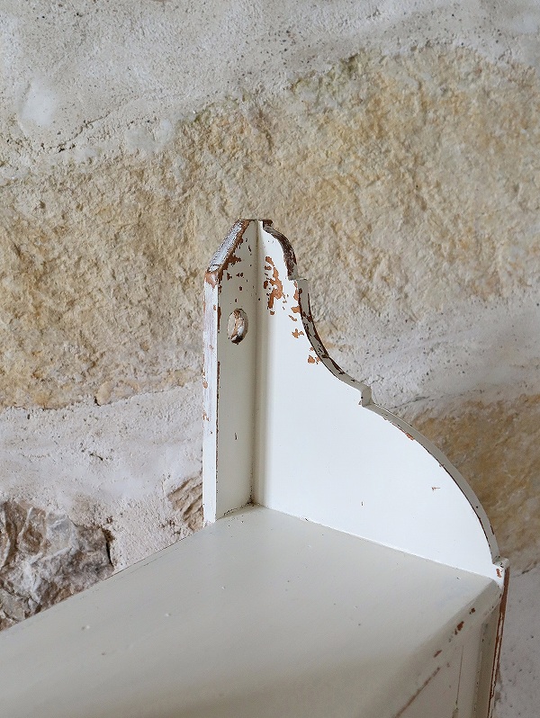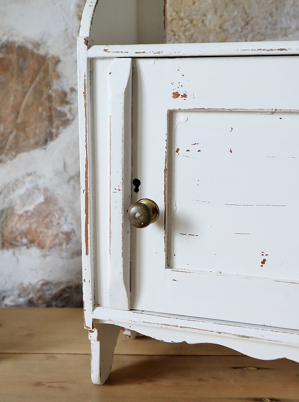 フランスのウォールキャビネットです。なみなみのかわいいデザインが目を引きます。壁掛けですが、小振りでキャビネットなどの上にも置きやすいです。置いて使われる時も壁に固定されると安心です。内部に固定棚が1枚付いていて、細々としたものの収納に便利です。