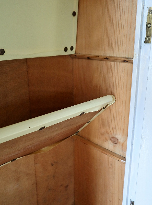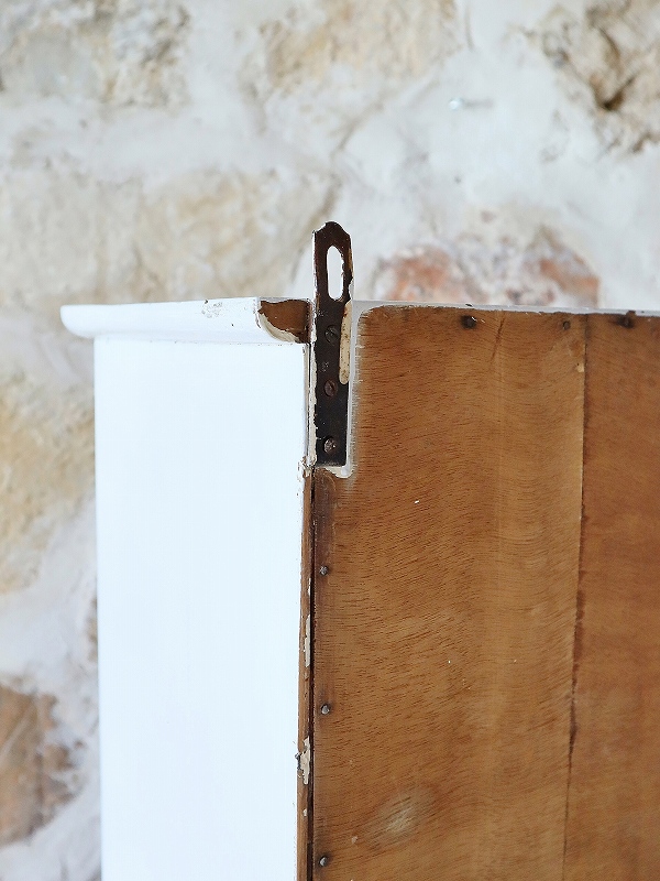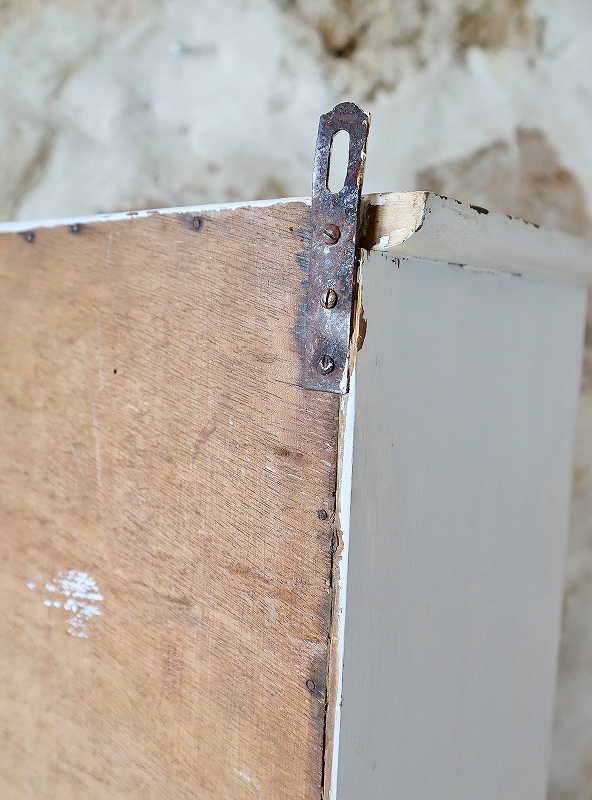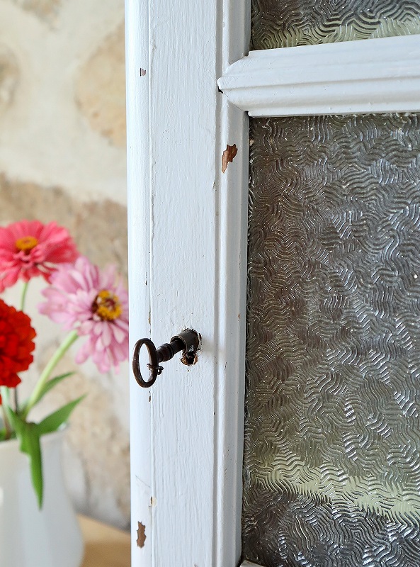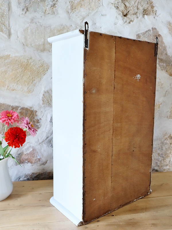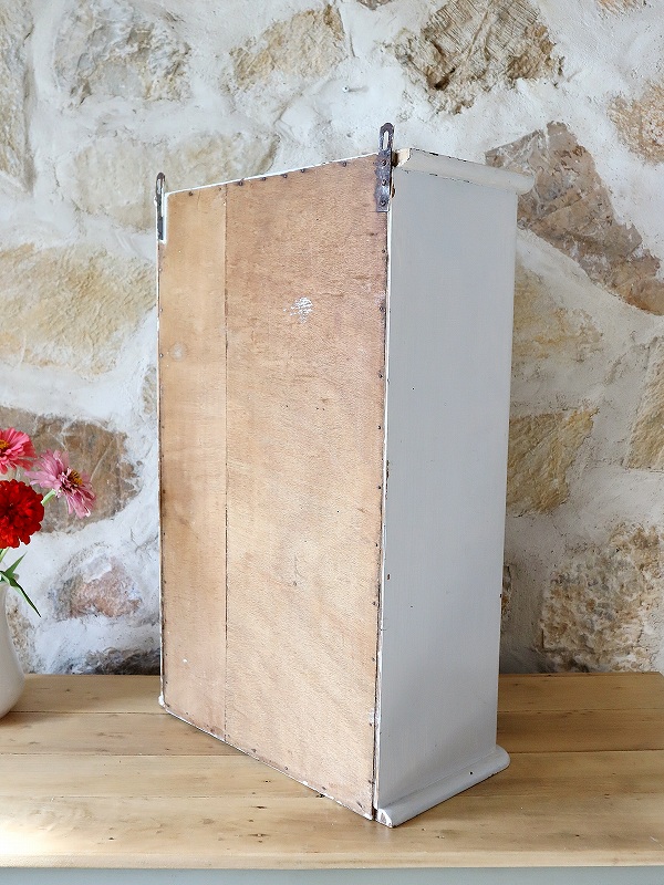 フランスのウォールキャビネットです。ペールブルーの色とガラスが大人っぽく素敵です。扉の内側のガラスに少しひびが入っていますが、表側からは見えず、使っていただくのに特に支障は無いかと思います。内部の棚は取り外しができ、クリーム色でかわいいです。壁につけることもできますが、安定していますので、家具の上に置いて使っていただくことも可能です。つまみが鍵になっていますが、鍵をかけることはできません。