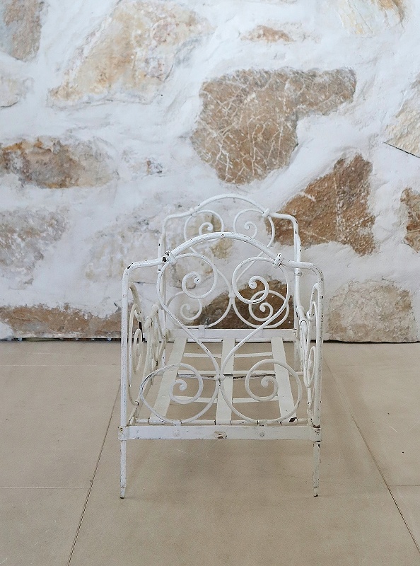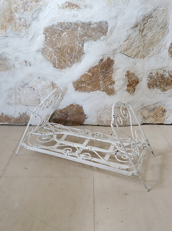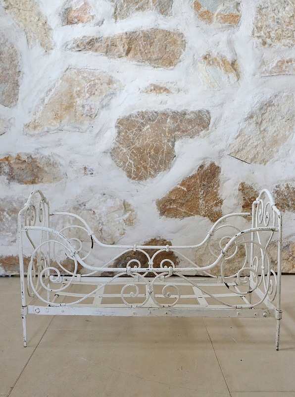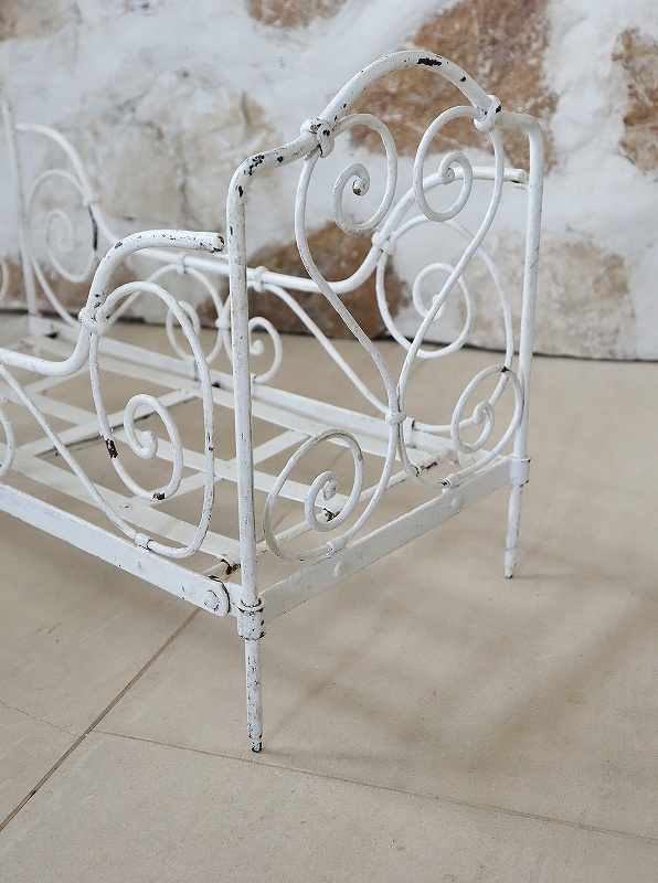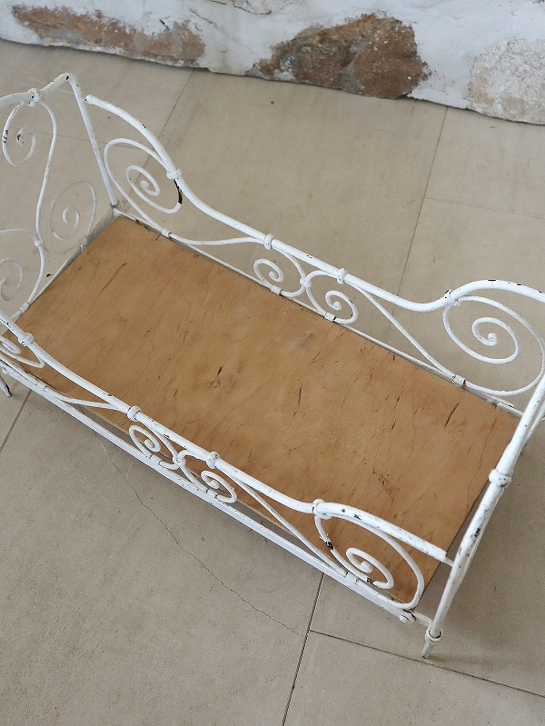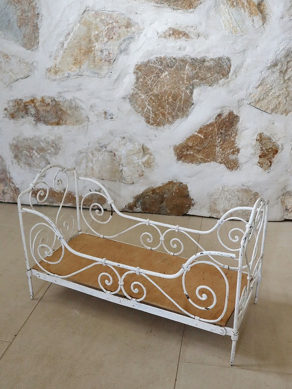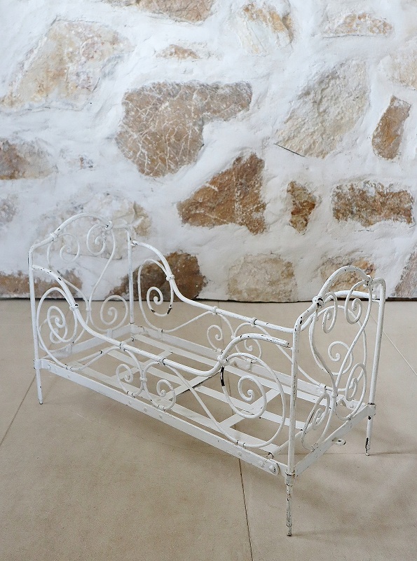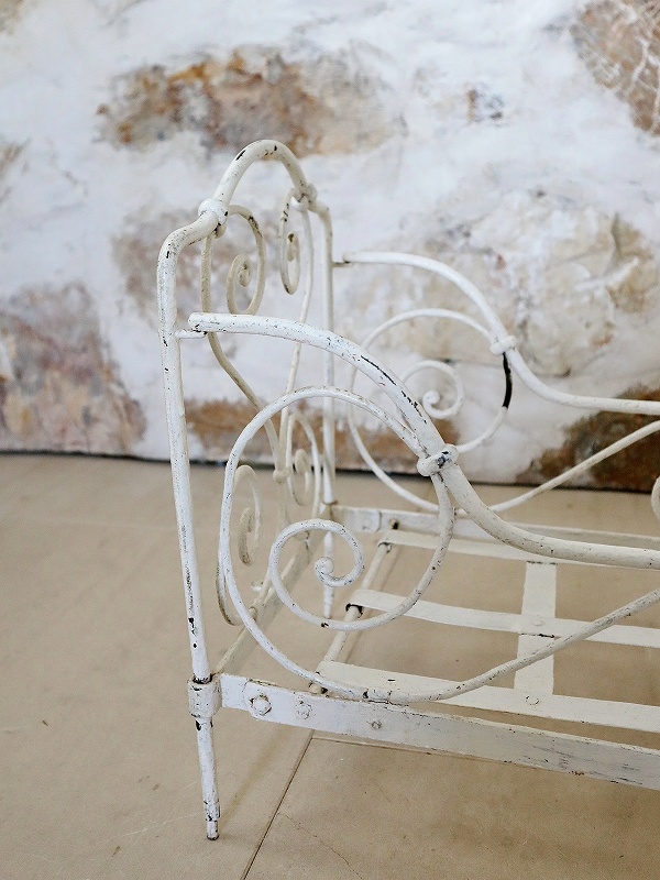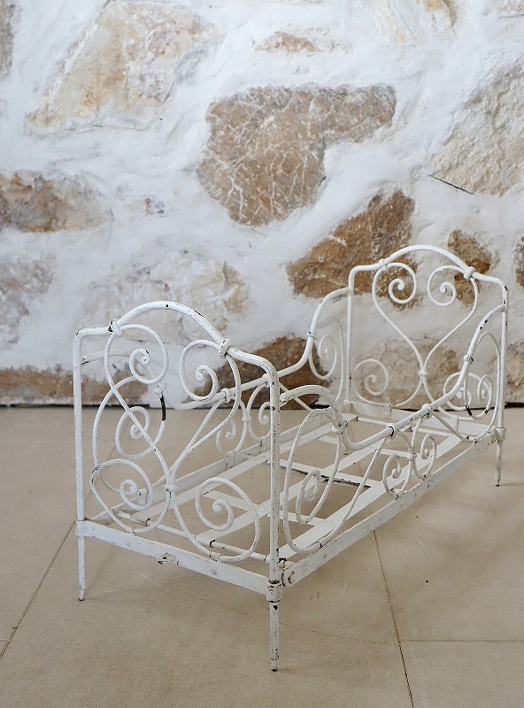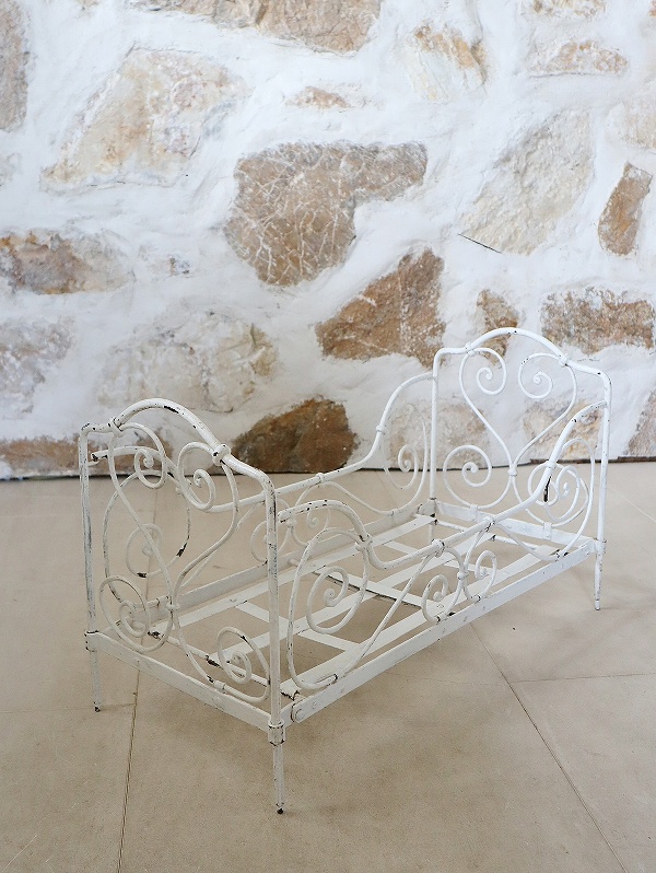 フランスのアイアン製ドールベッドです。ドールベッドですが、本格的な造りで、天蓋ポールはないですが、ソファの形にもできます。ペンキもぽってりホワイトでかわいいです。