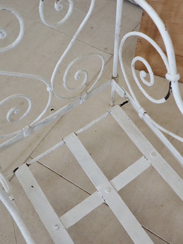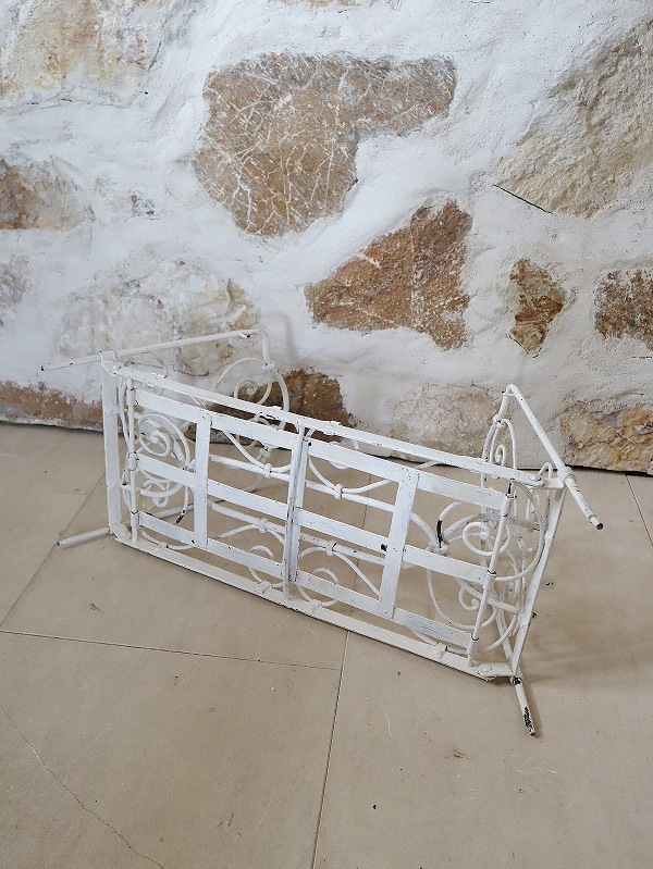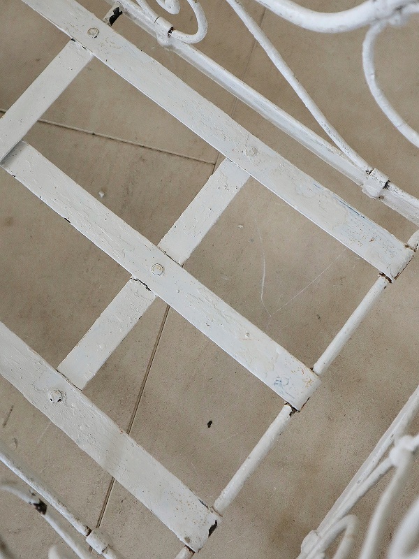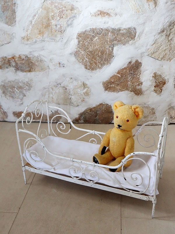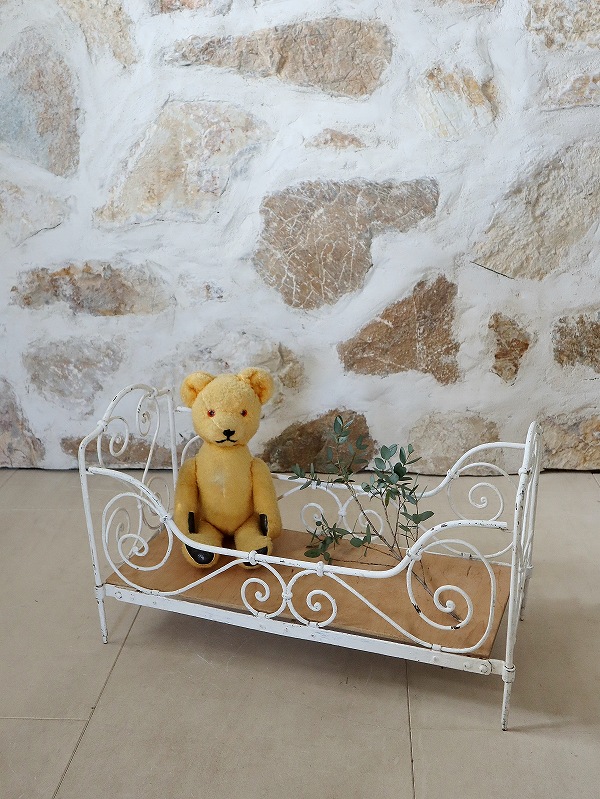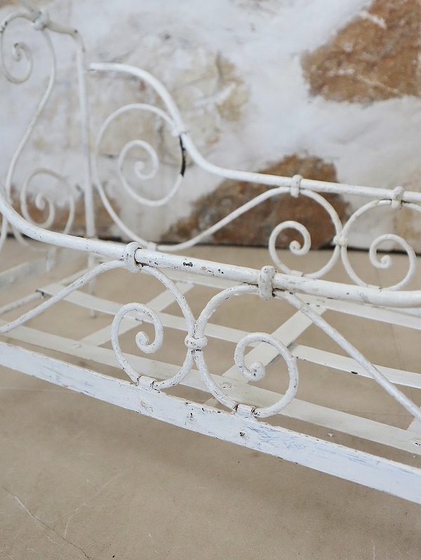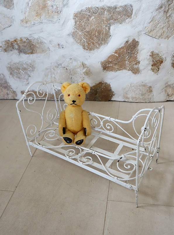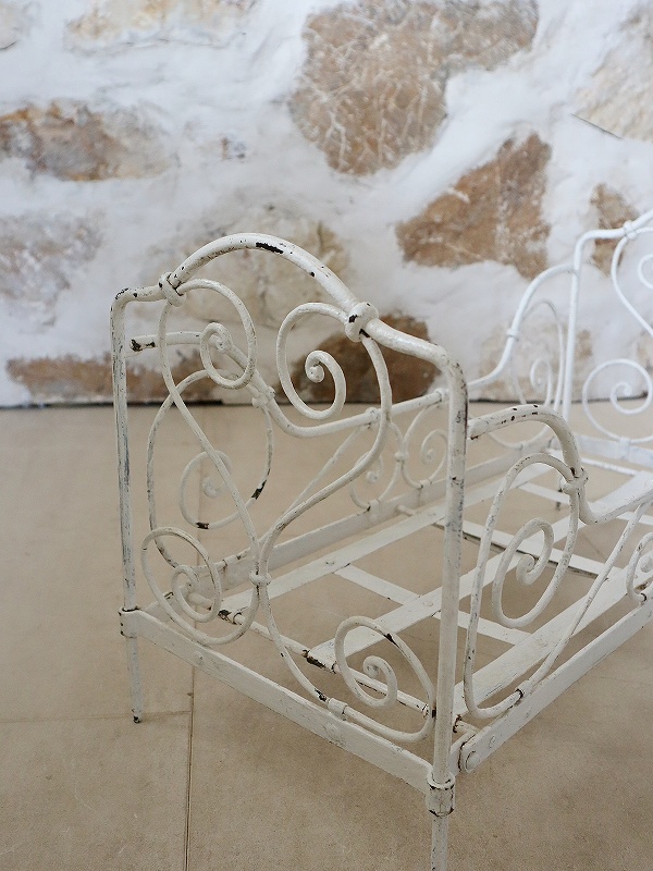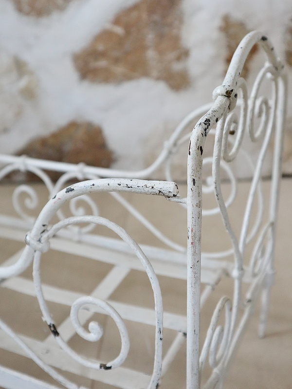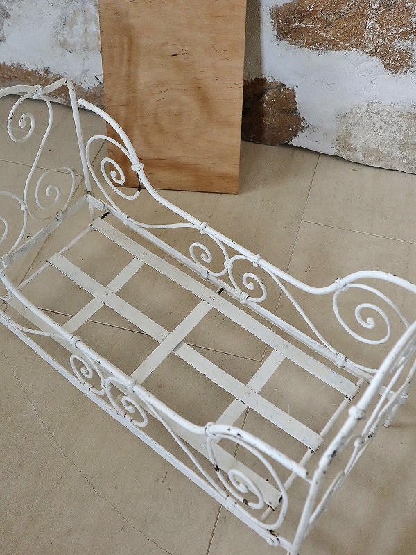 フランスのアイアン製ドールベッドです。ドールベッドですが、本格的な造りで、天蓋ポールはないですが、ソファの形にもできます。ペンキもぽってりホワイトでかわいいです。