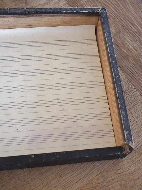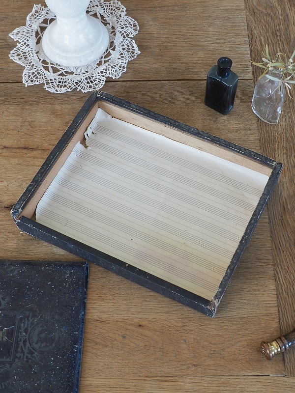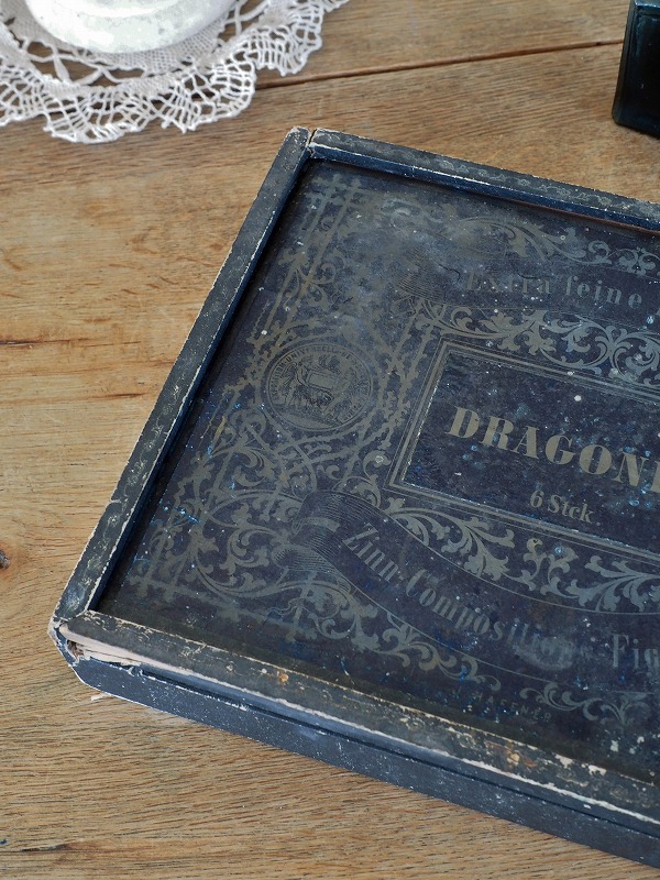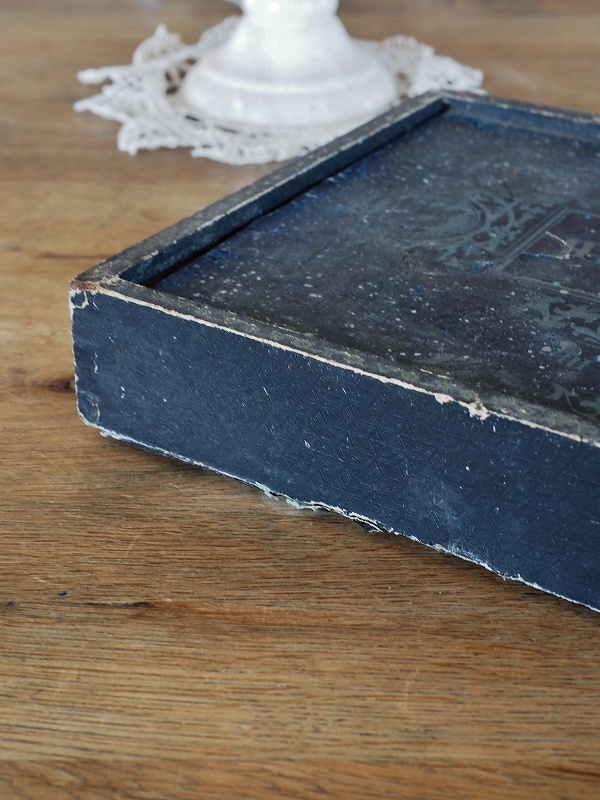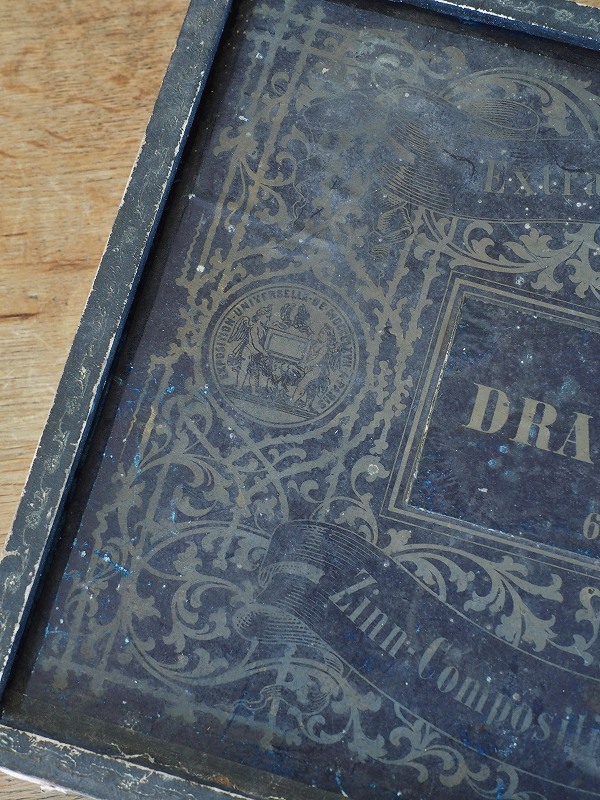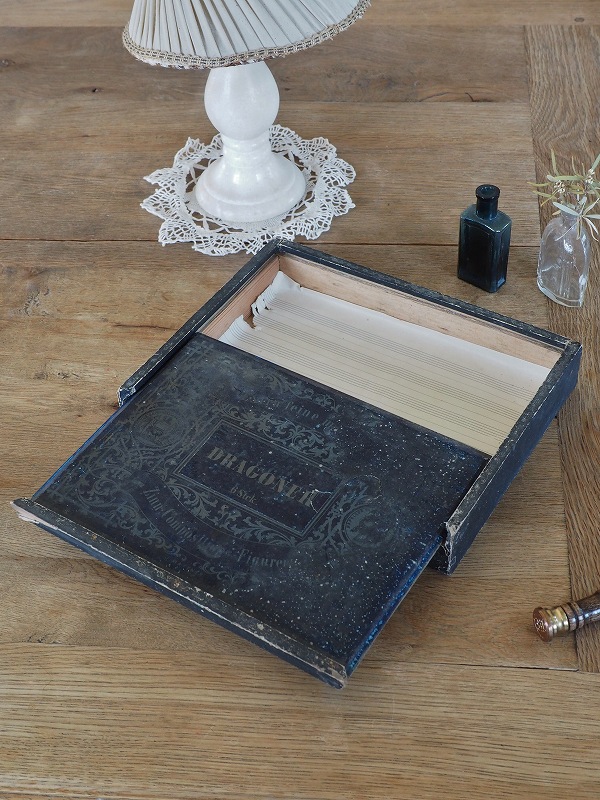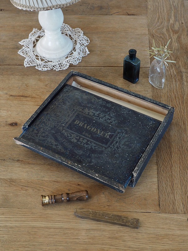 フランスの150年ほど前の木箱です。表面に貼られた紙には、パリエキスポのマークとナポレオン三世のマークが付いていて、1855年のパリで開催された万博を記念して作られた木箱だと思われます。とても雰囲気があり素敵です。手前に引くと蓋が動き、収納ができます。
