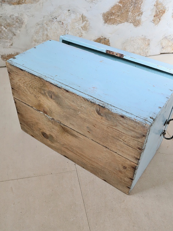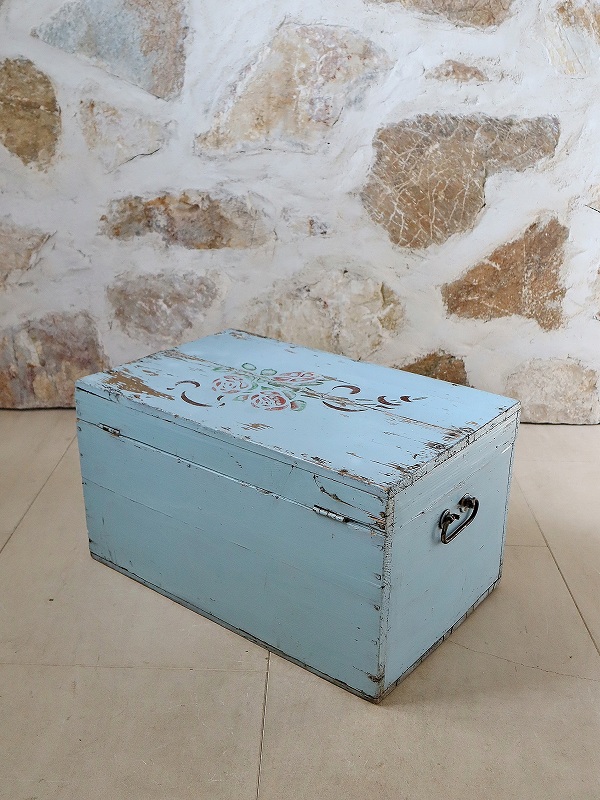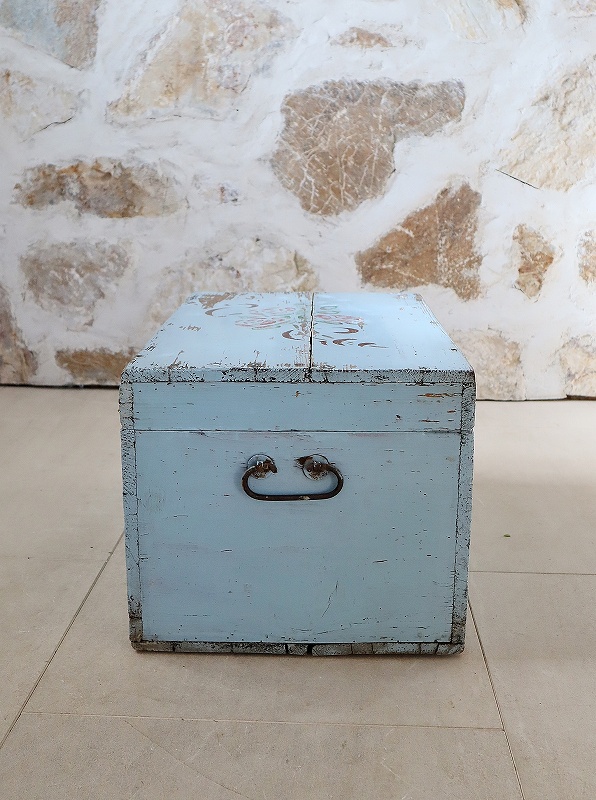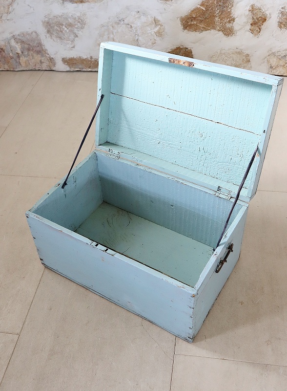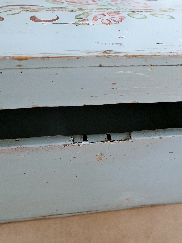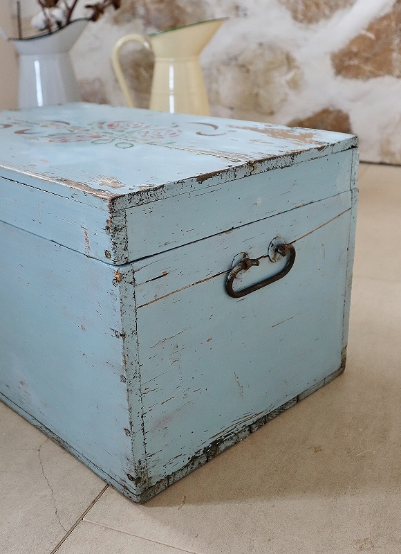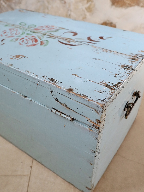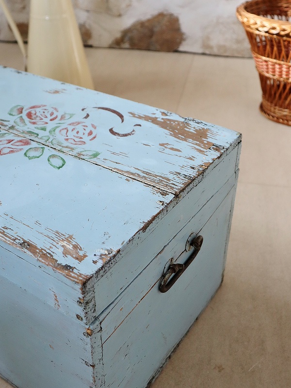 フランスの木製ボックスです。ブルーに薔薇の模様がかわいいです。内部までブルーで収納やディスプレイが楽しくなります。紐が付いていますので、開けっ放しにもできます。丁番の釘が少し浮いていますが取れたりはしないと思います。