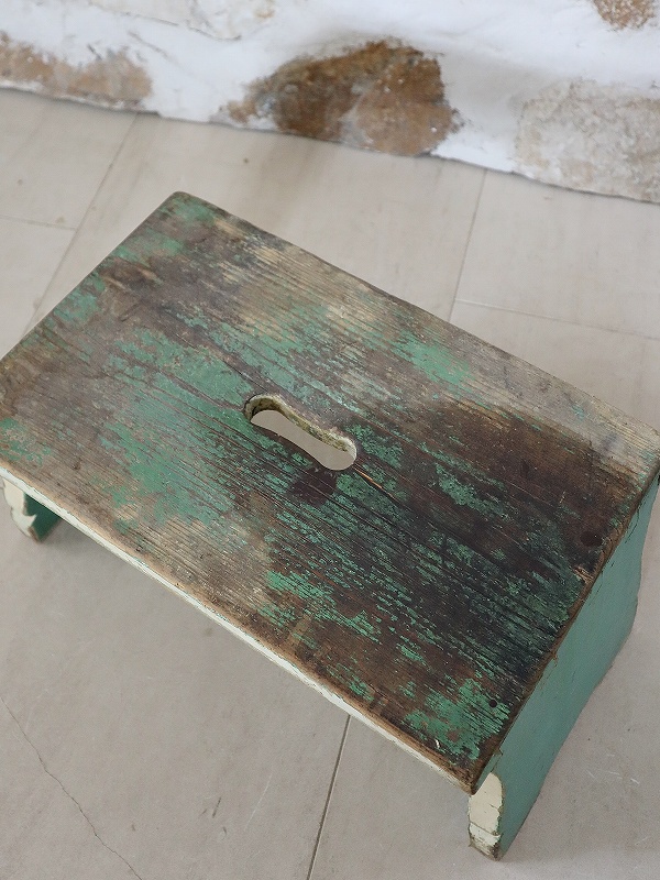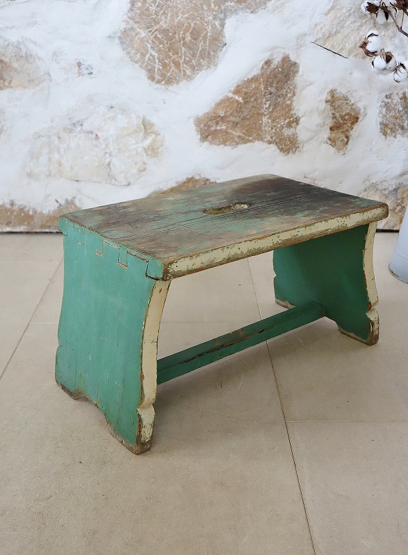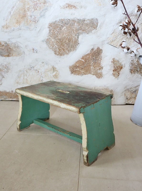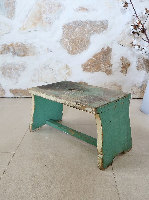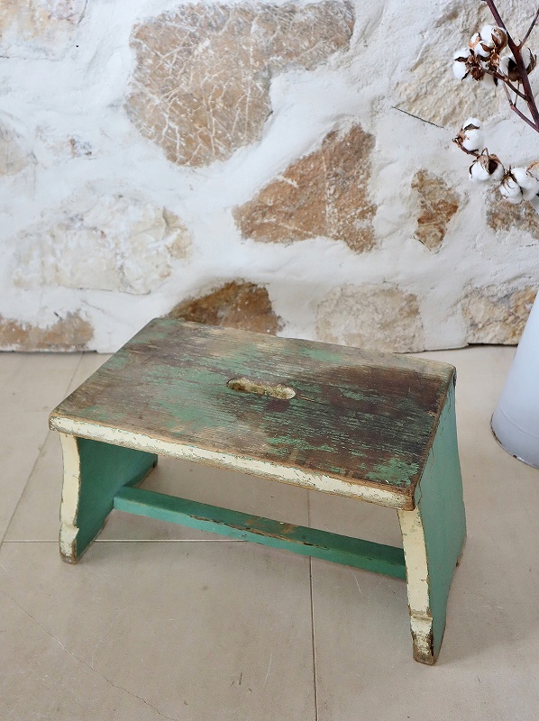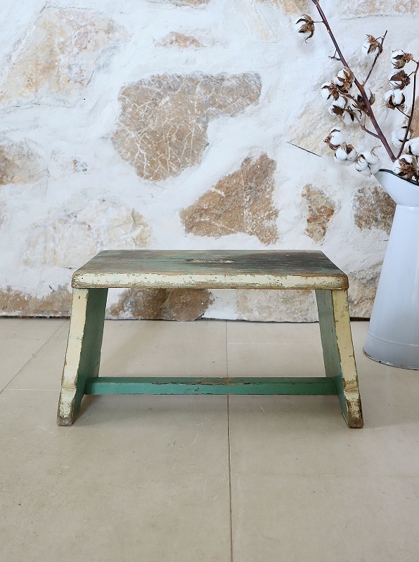 フランスで買い付けしたフットレストです。古いペイントがシャビーで、素朴な雰囲気、質感が素敵です。ヨーロッパでは人気があり、小物と一緒に使っていただいたり、重ねてディスプレイいただくと素敵です。少し大き目でしっかりしています。