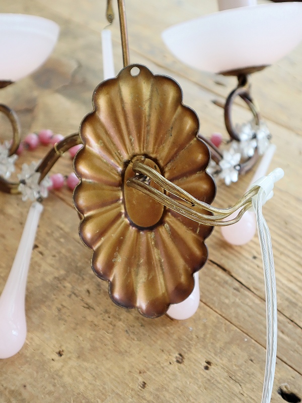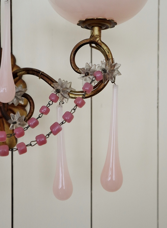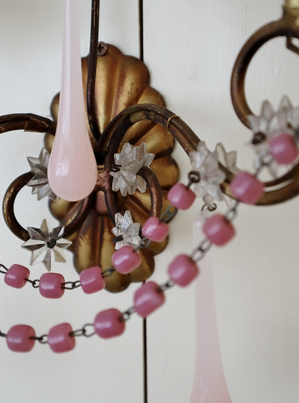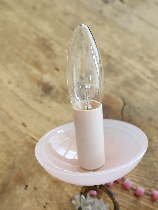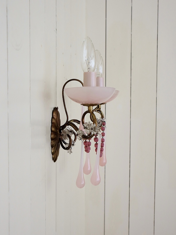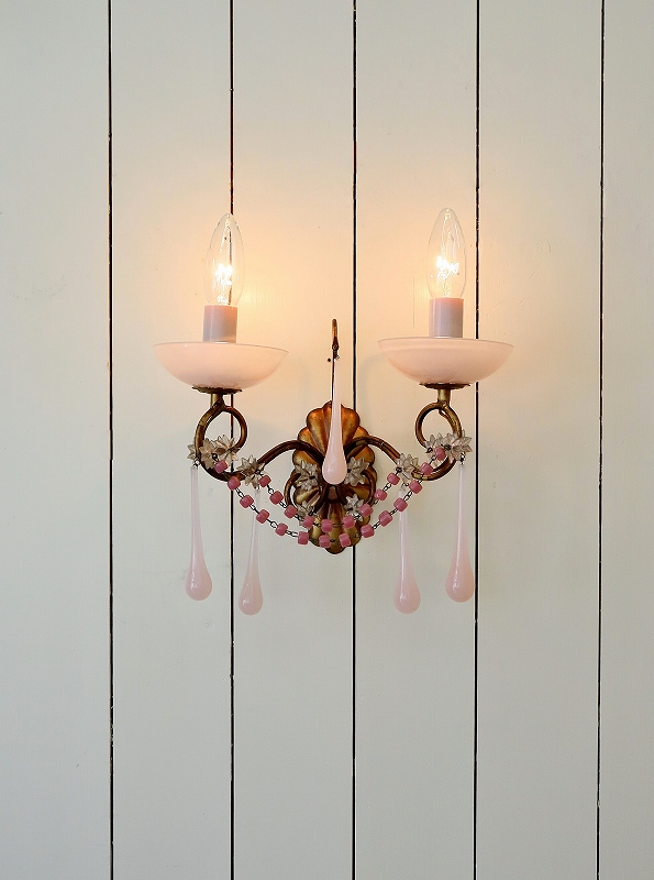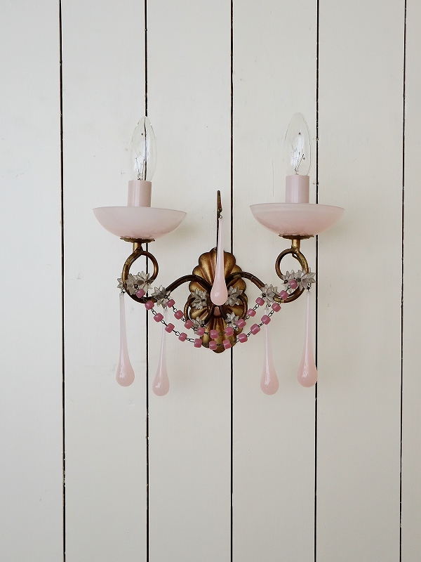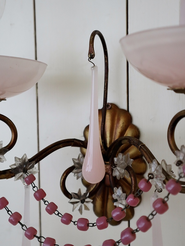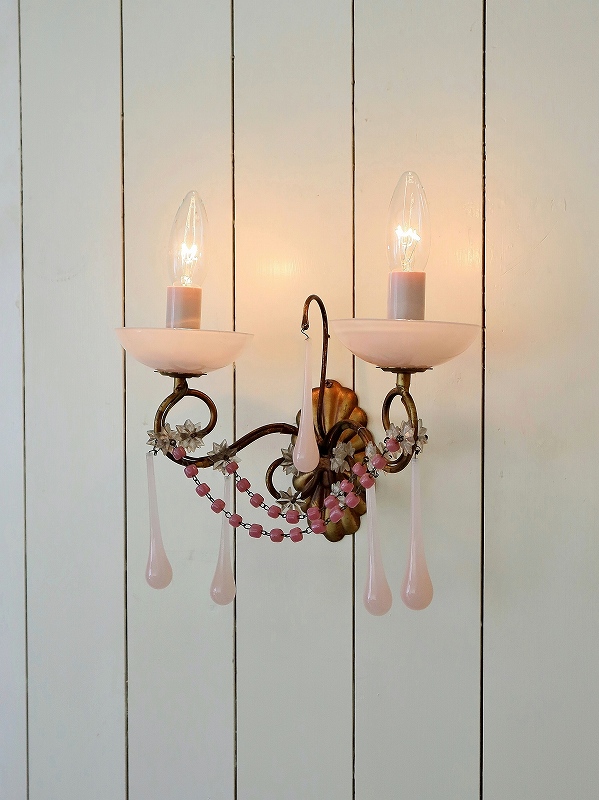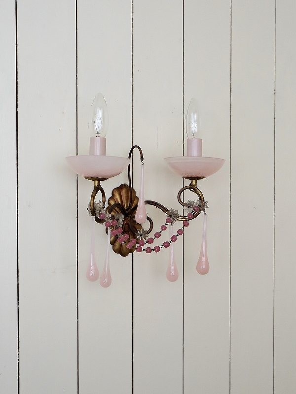 フランスの2灯ウォールライトです。ロウソクの座とティアーズドロップがピンクのオパリンガラスになっていて、真鍮のデザインやビーズと共にかわいいです。もう一つ似たものがありますが、こちらは蝋燭の筒がピンクのプラスチック製です。新築工事中に取付をされる場合は直接つなぐこともできますが、壁に掛けることもできますので、ご希望があれば、新しいコンセント+中間スイッチを付けることも可能(有料)です。ランプはE14の海外球をサービスでお付けさせていただきますが、大型ホームセンターさんなどにも販売されています。PSE検査もしていますので、安心してご使用いただけます。
