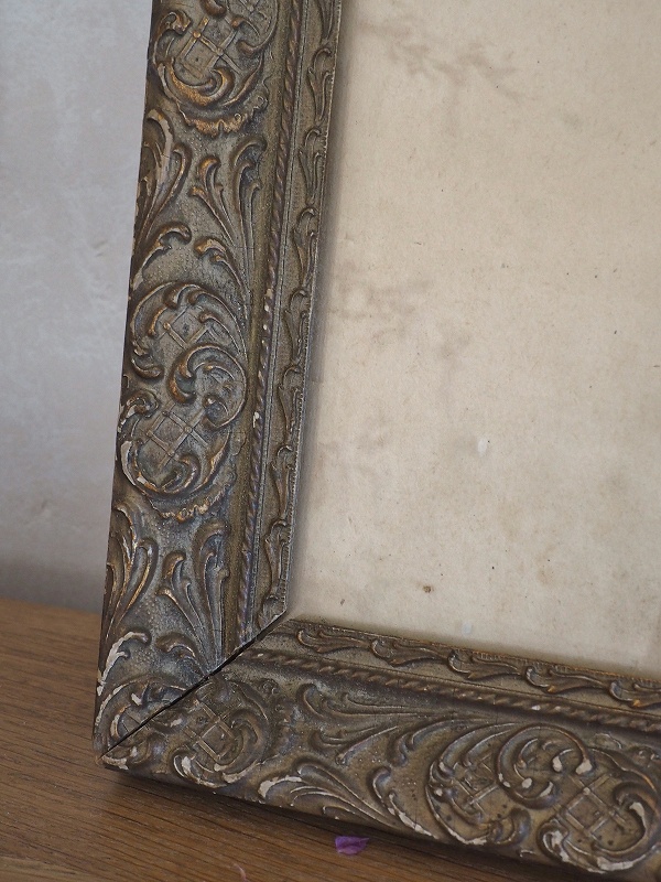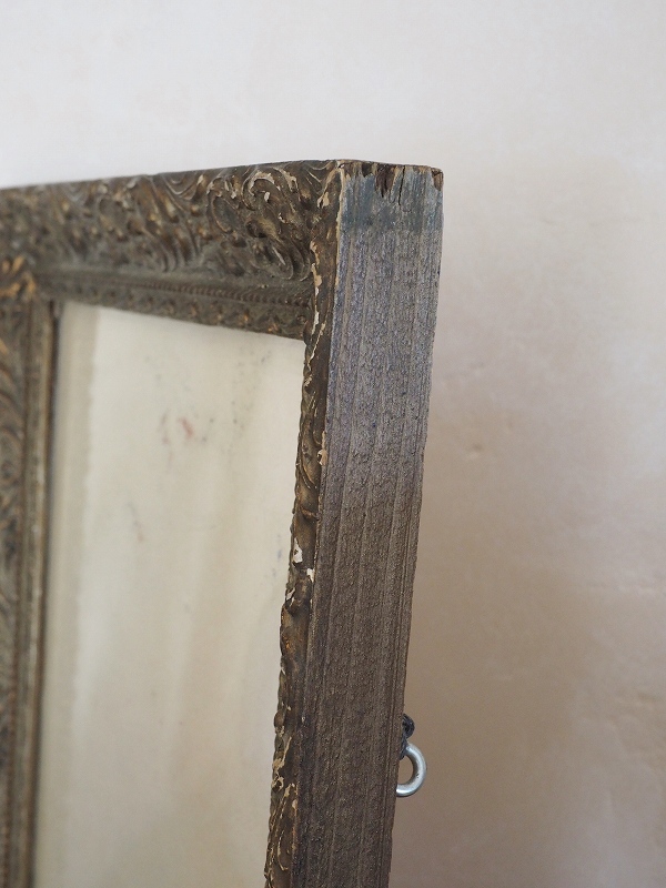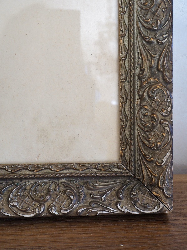 フランスの木製フレームです。ミッドセンチュリー時代のゴールドの色と凝ったデザインが雰囲気があります。ガラスも付いていて素敵です。