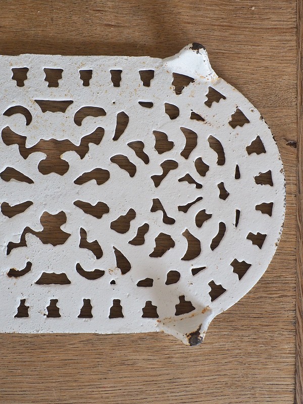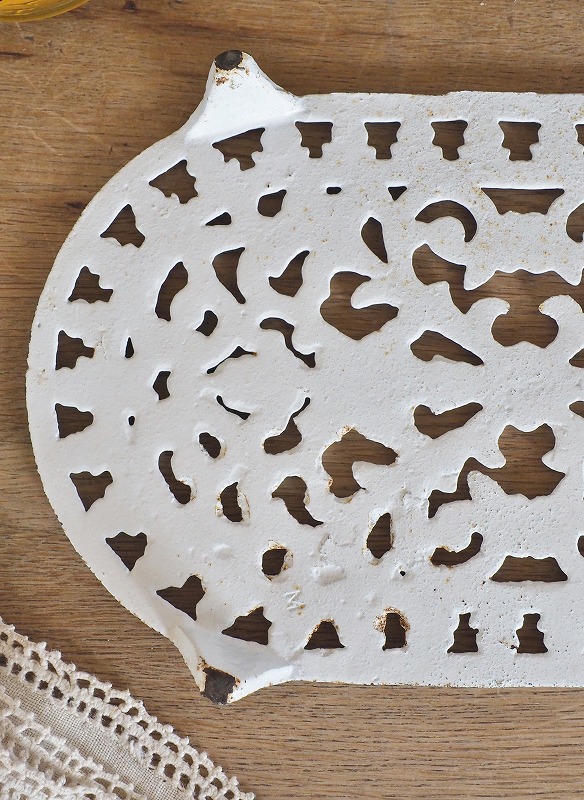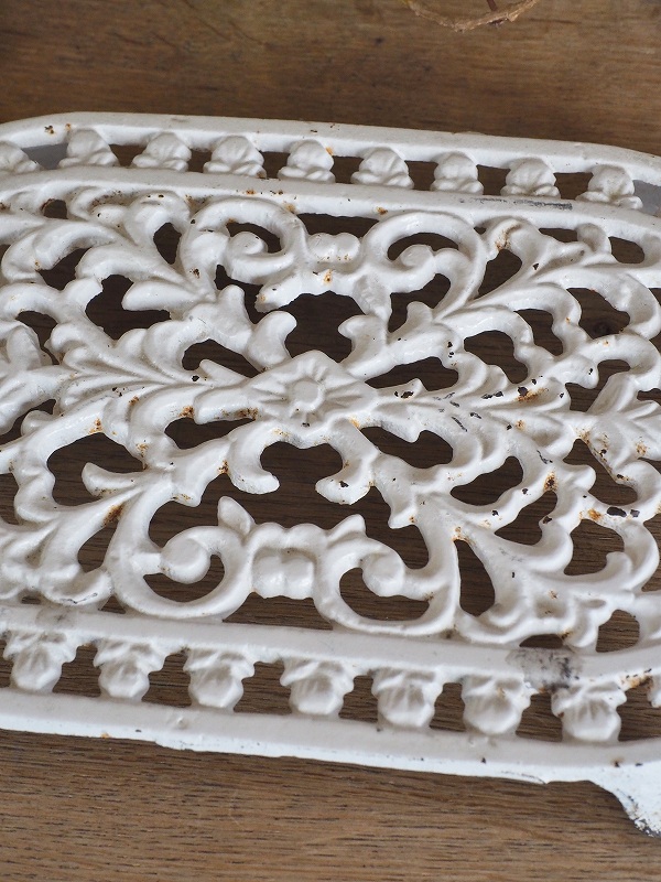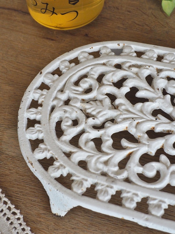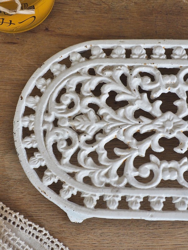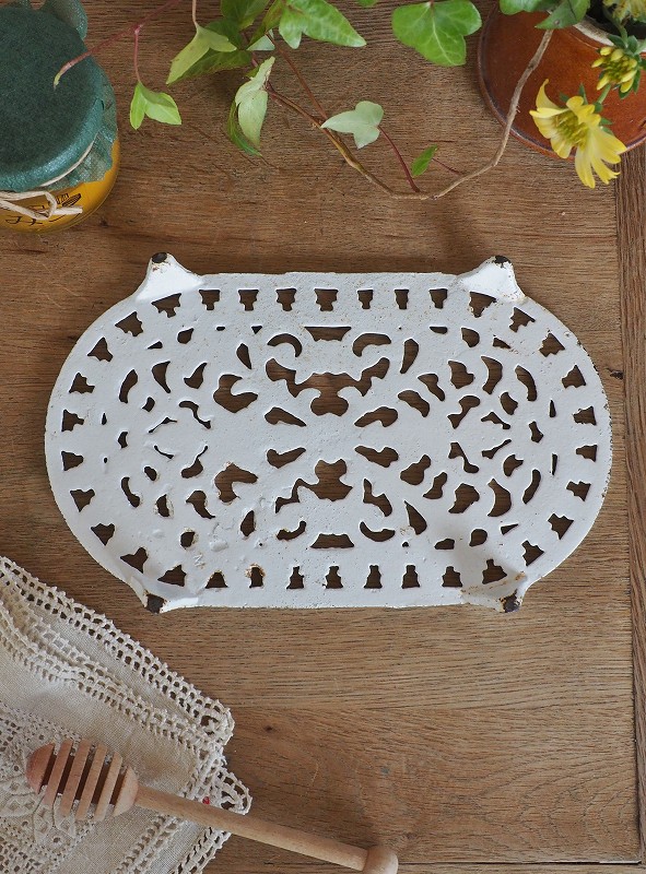 フランス製のデザインが素敵なアイアン製トリベット(鍋敷き)です。現代にはない凝った素敵なデザインで大人っぽく、キッチンが楽しくなるアイテムです。特に模様が繊細で形も楕円で素敵です。大きなお鍋なども置きやすいです。