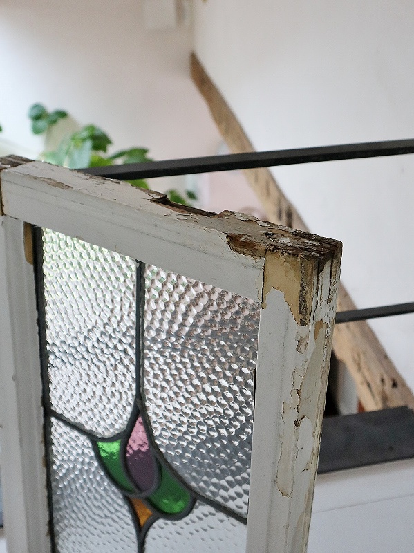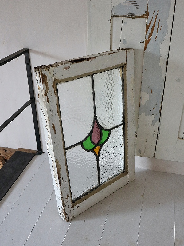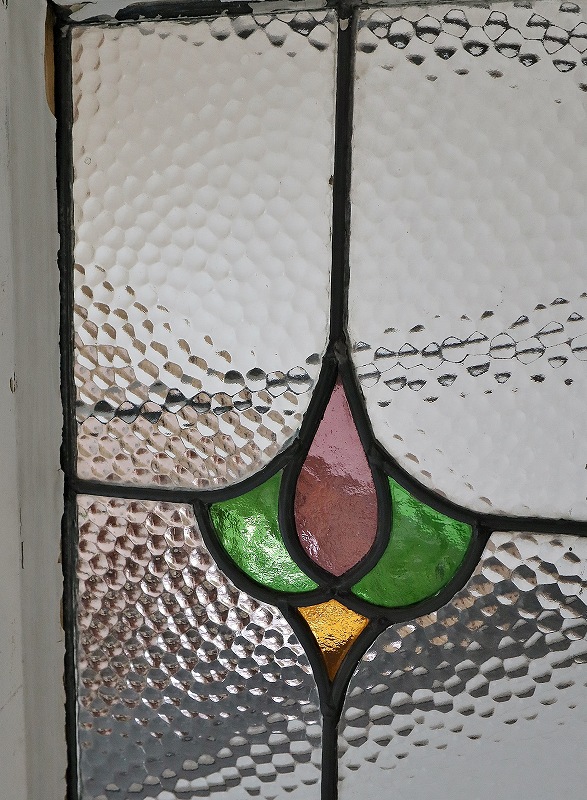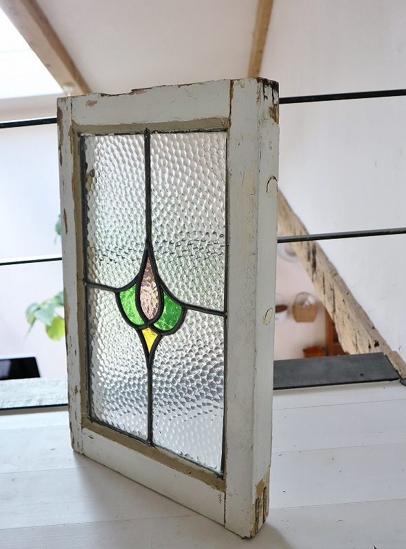 古い木枠が付いたイギリスのステンドグラスです。ポコポコガラスにワンポイントがかわいいです。年代の古い細めのカーム(鉛)が華奢な雰囲気を出していて素敵です。
