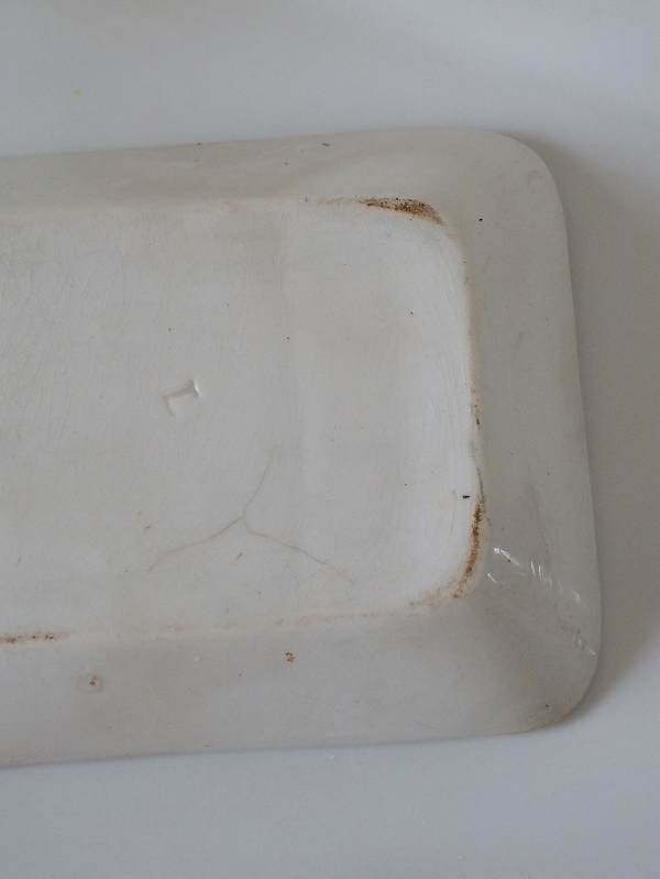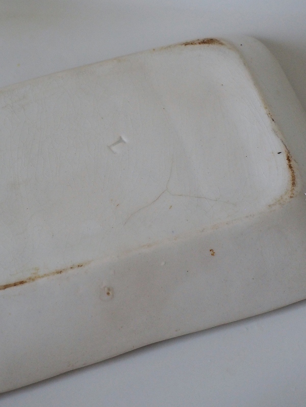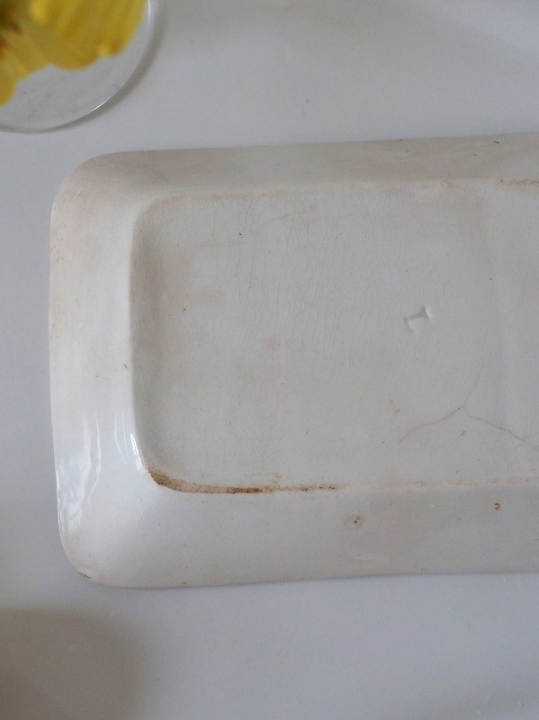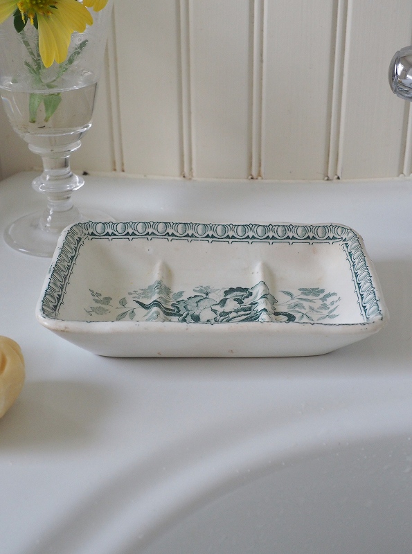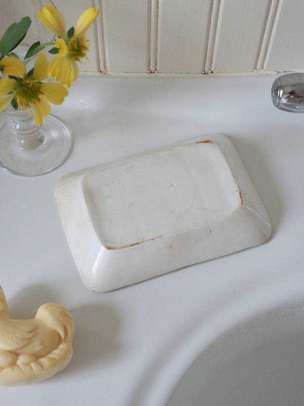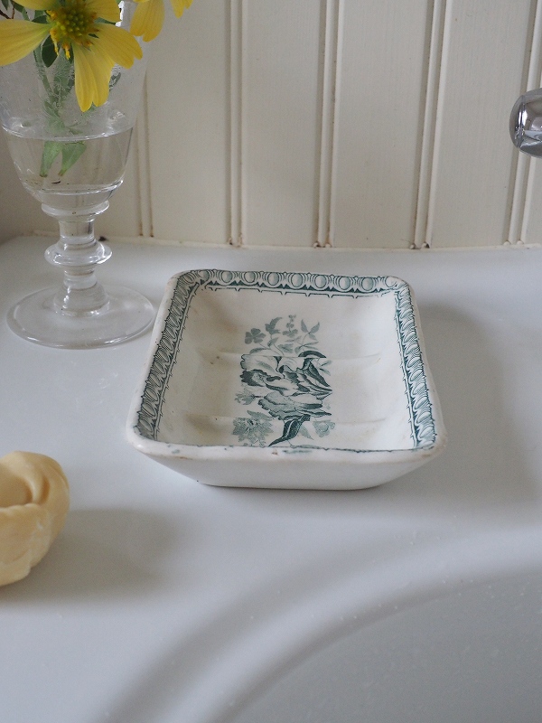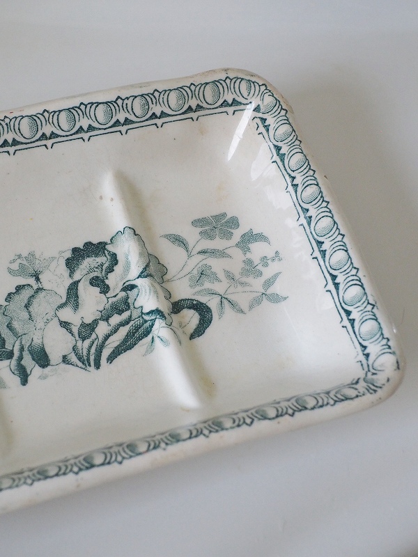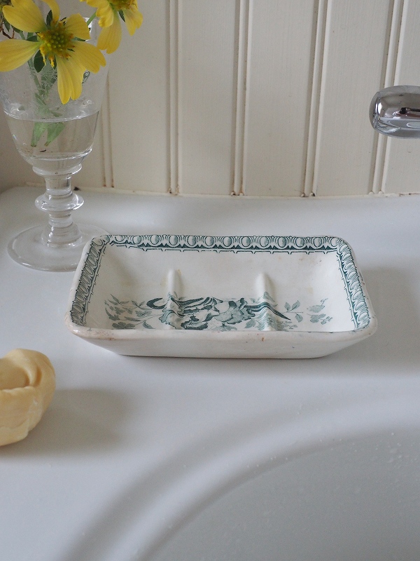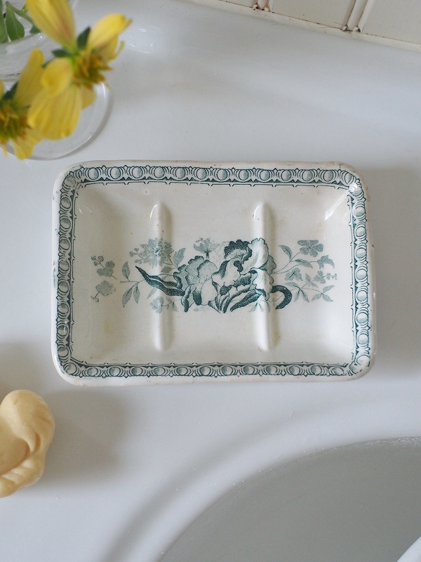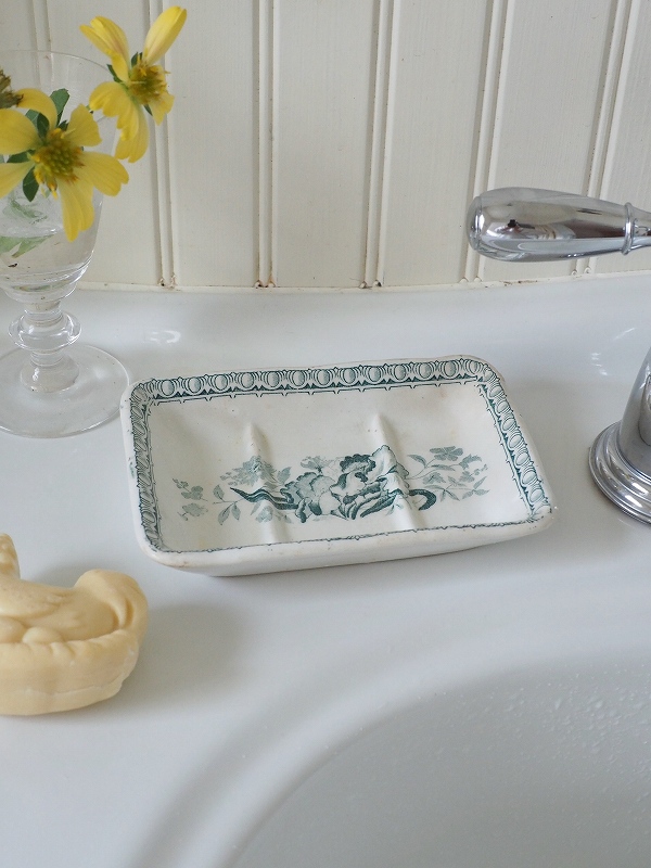 フランスのソープディッシュです。古い陶器の質感と淡色の大人っぽい絵柄がとても素敵です。裏に細いクラックが入っていますが、特に問題はないです。
