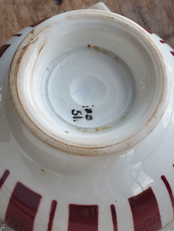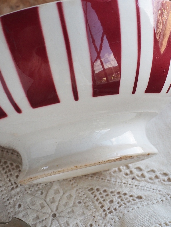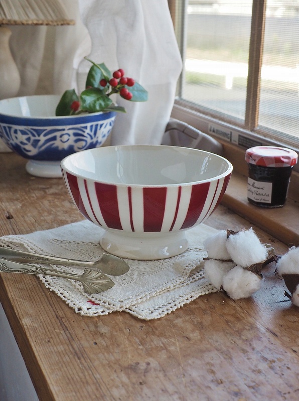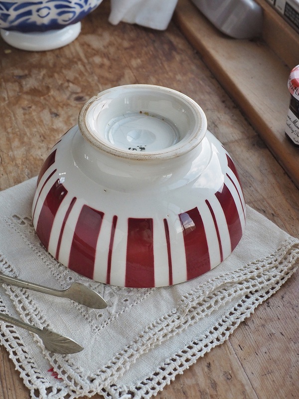 フランスのカフェオレボウルです。赤いストライプと少し低めのフォルムがかわいいです。製造時の古い汚れや底の裏側にクラックが見られますが、古い質感がとても素敵なカフェオレボウルです。